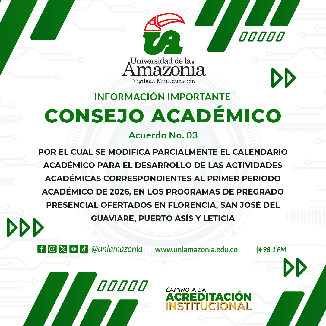 El Consejo Académico de la Universidad de la Amazonia da a conocer el Acuerdo No. 03 de 2026 “Por el cual se modifica parcialmente el Calendario Académico para el desarrollo de las actividades académicas correspondientes al primer periodo académico de 2026, en los programas de pregrado presencial ofertados en Florencia, San José del Guaviare, Puerto Asís y Leticia"