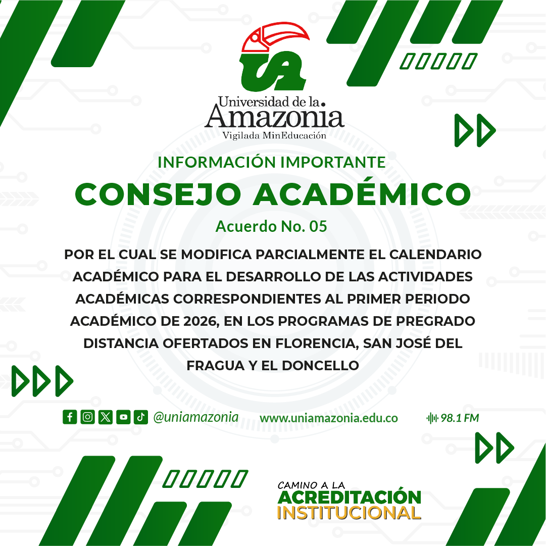 El Consejo Académico de la Universidad de la Amazonia da a conocer el Acuerdo No. 05 de 2026 “Por el cual se modifica parcialmente el Calendario Académico para el desarrollo de las actividades académicas correspondientes al primer periodo académico de 2026, en los programas de pregrado distancia ofertados en Florencia, San José del Fragua y El Doncello"