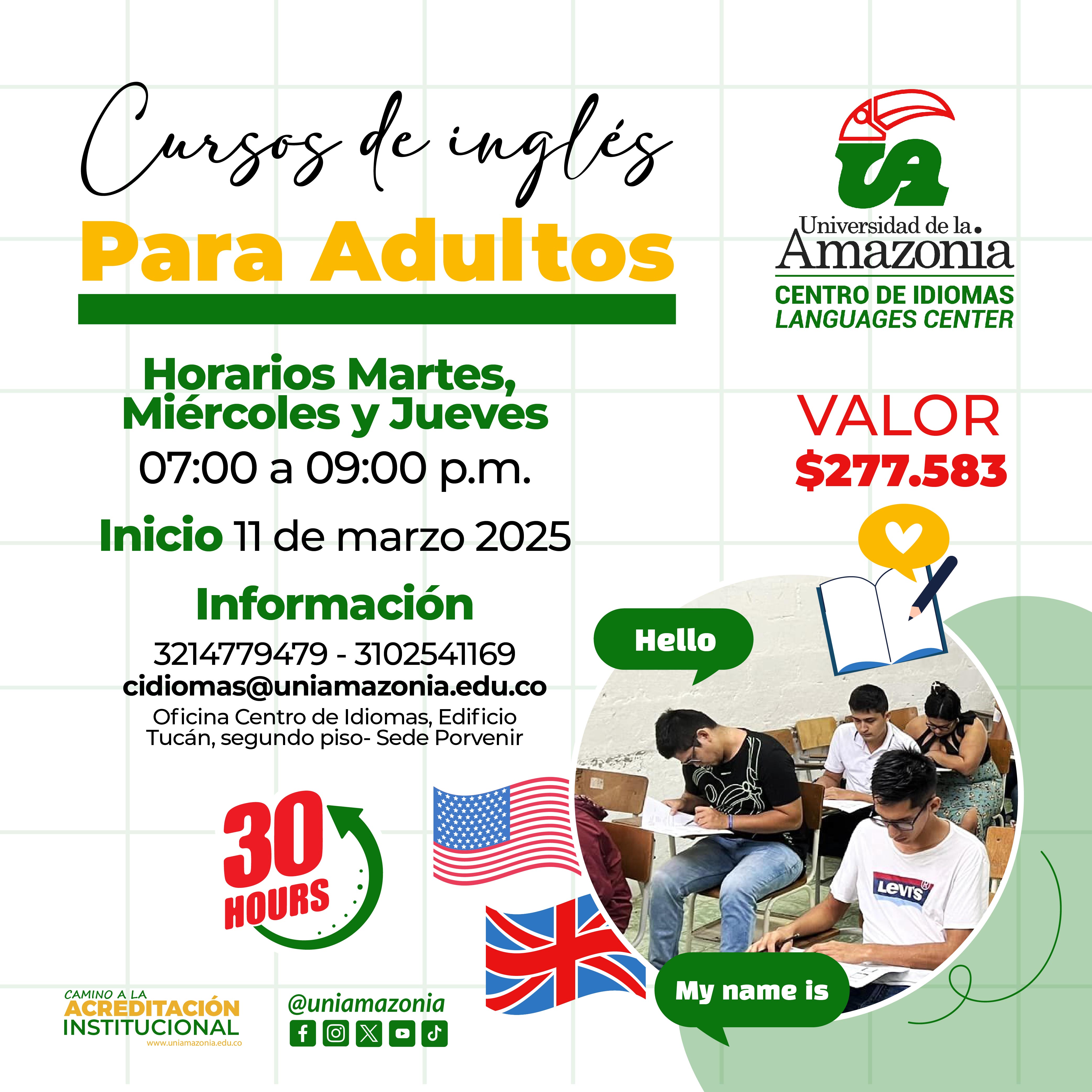 El Centro de Idiomas de la Universidad de la Amazonia informa a la comunidad universitaria y caqueteña la apertura de inscripciones para los cursos de inglés dirigidos a adultos.
