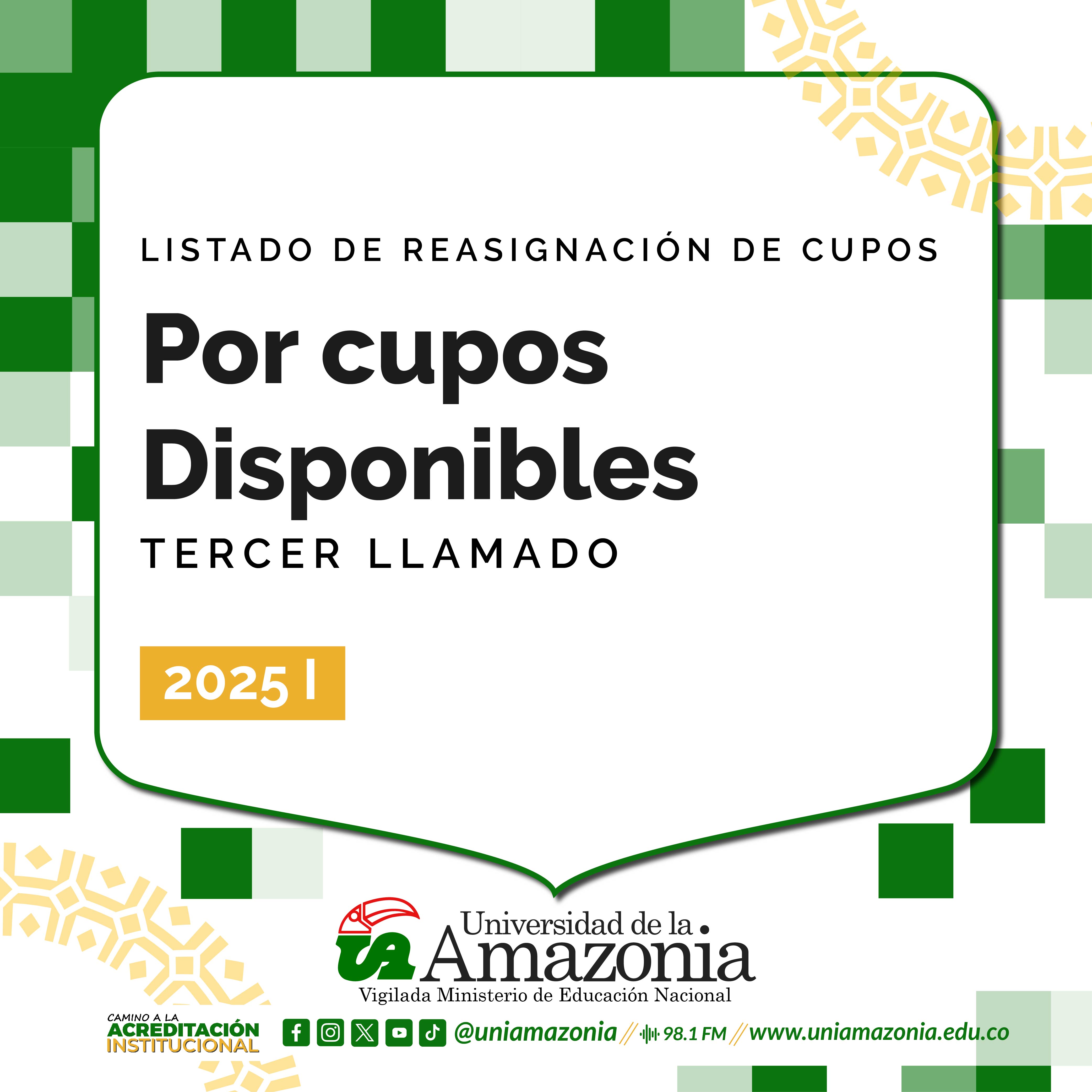 De conformidad con el Calendario Académico para el desarrollo de las actividades correspondientes al primer período académico de 2025, en los Programas de Pregrado presencial y a distancia ofertados en Florencia, se publica la reasignación de cupos no matriculados, tercer llamado e invitación a postulación en los programas que aplique.