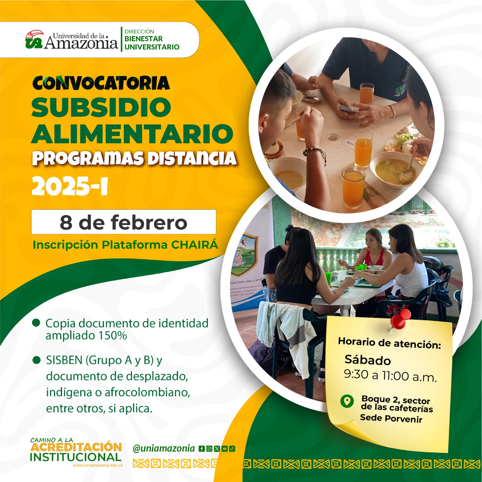 La Universidad de la Amazonia desde la Dirección de Bienestar Universitario área de Promoción y Apoyo Socioeconómico, da a conocer a la comunidad estudiantil modalidad a Distancia que se realizará recepción de documentación para quienes deseen hacer parte de los programas de apoyo socioeconómico, Subsidio Alimentario y Tablet´s Uniamazonia: