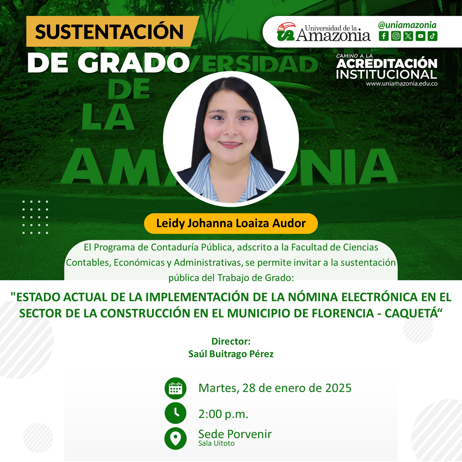 La Universidad de la Amazonia, a través del Programa de Contaduría Pública adscrito a la Facultad de Ciencias Contables, Económicas y Administrativas, tiene el agrado de invitar a la comunidad universitaria y al público en general a la sustentación pública del trabajo de grado: