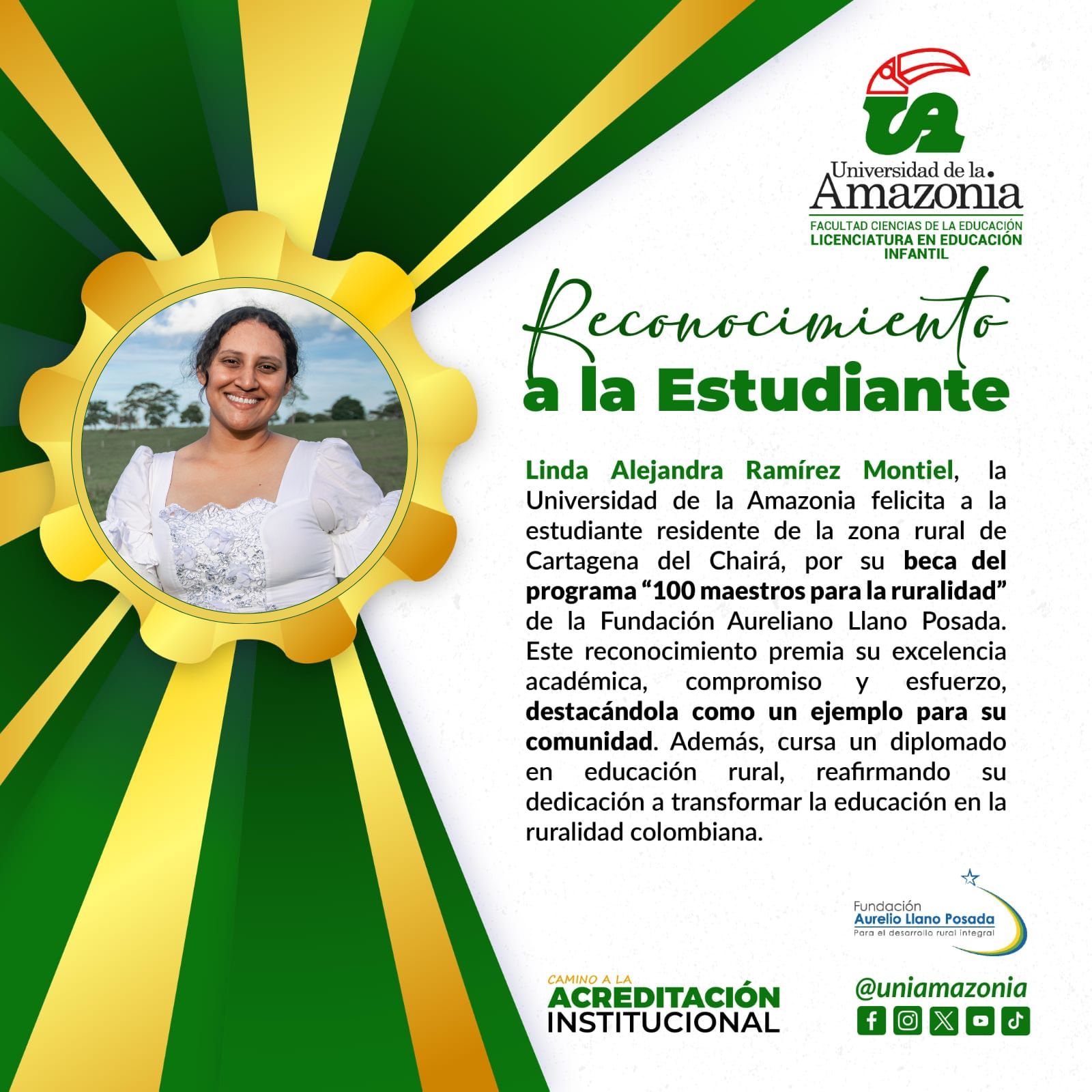 La Universidad de la Amazonia felicita a Linda Alejandra Ramírez Montiel, destacada estudiante de la Licenciatura en Educación Infantil, por recibir una beca de la Fundación Aureliano Llano Posada en el programa “100 maestros para la ruralidad”. Residente de Cartagena del Chairá, Linda es reconocida por su excelente desempeño académico, conducta ejemplar y compromiso con su comunidad. Además, cursa un diplomado en educación rural en la Universidad de los Llanos, reforzando su compromiso con la mejora educativa en zonas rurales. Linda expresó su gratitud por este apoyo, que impulsa su meta de contribuir al desarrollo educativo de su región. Su logro inspira a toda la comunidad académica.
