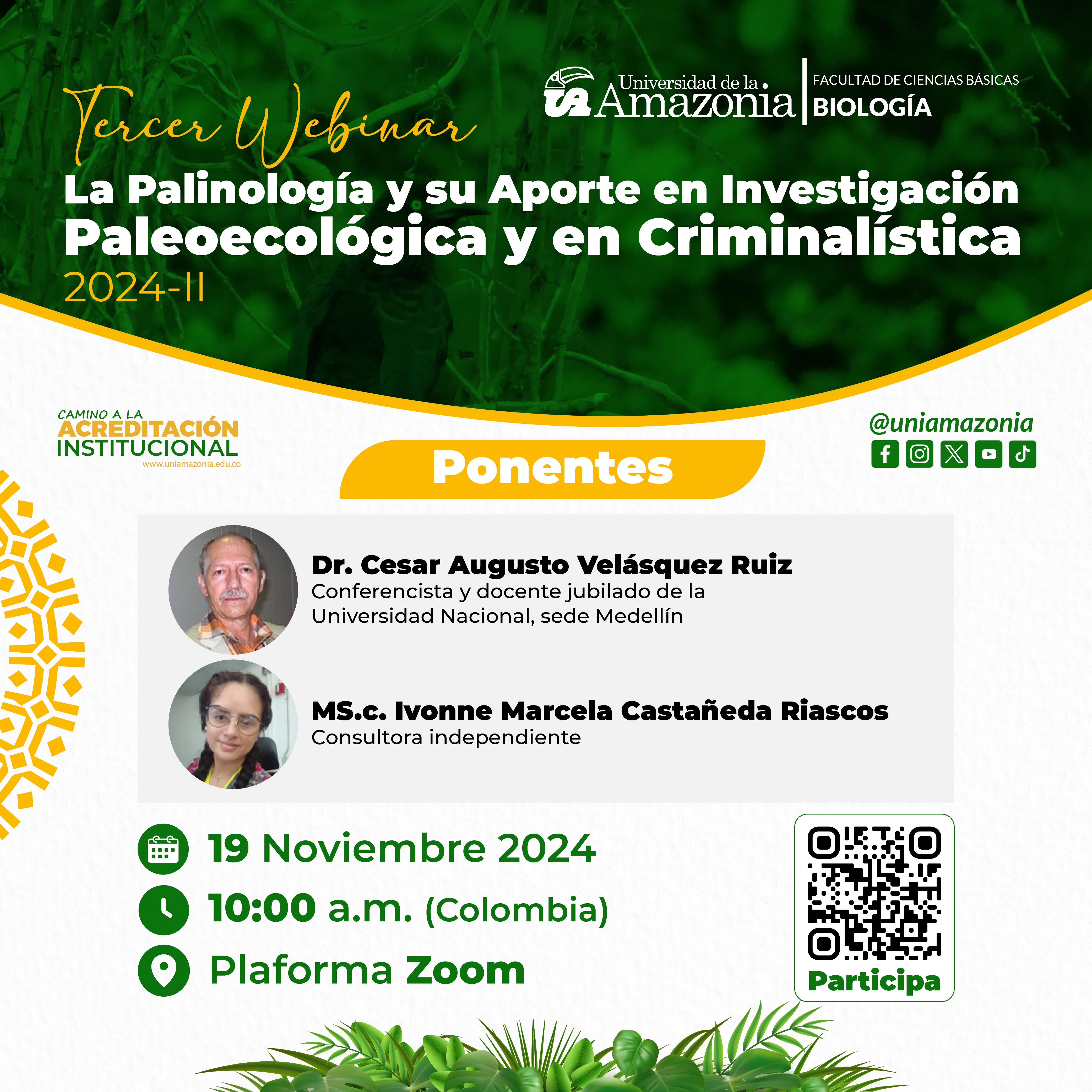 La Facultad de Ciencias Básicas y el Programa de Biología los invitan a participar del tercer webinar: "La Palinología y su Aporte en Investigación Paleoecológica y Criminalística", que se realizará el 19 de noviembre de 2024 a las 10:00 a.m. Dirigido por el Dr. César Augusto Ruíz y la M.Sc. Ivonne Marcela Castañeda. ¡No se lo pierdan!