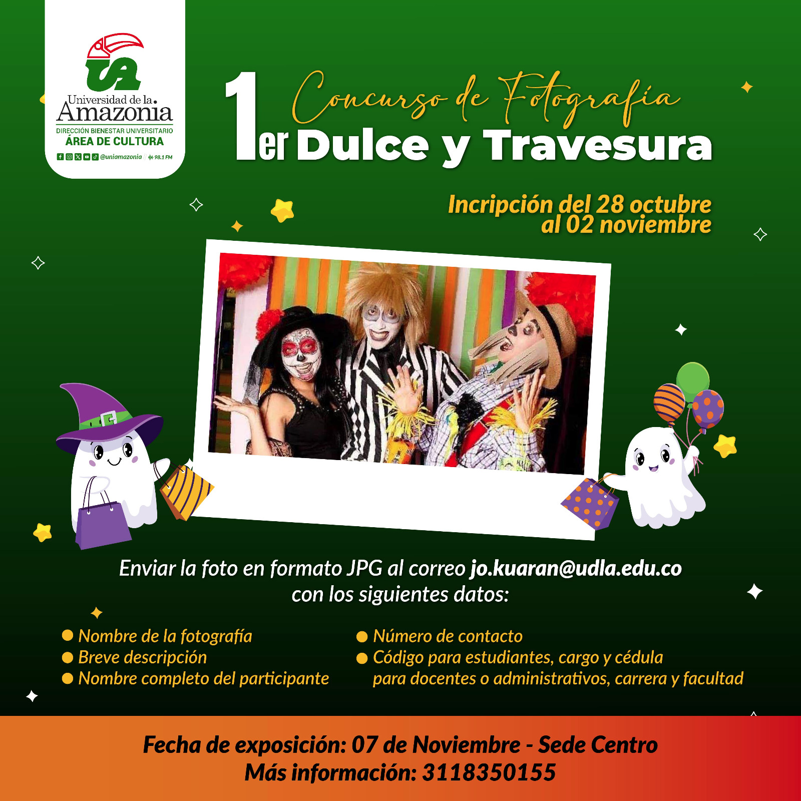 La Universidad de la Amazonia invita a la comunidad institucional a participar del 1.er Concurso de Fotografía "Dulce y Travesura", que se realizará del 31 de octubre al 7 de noviembre del presente año.