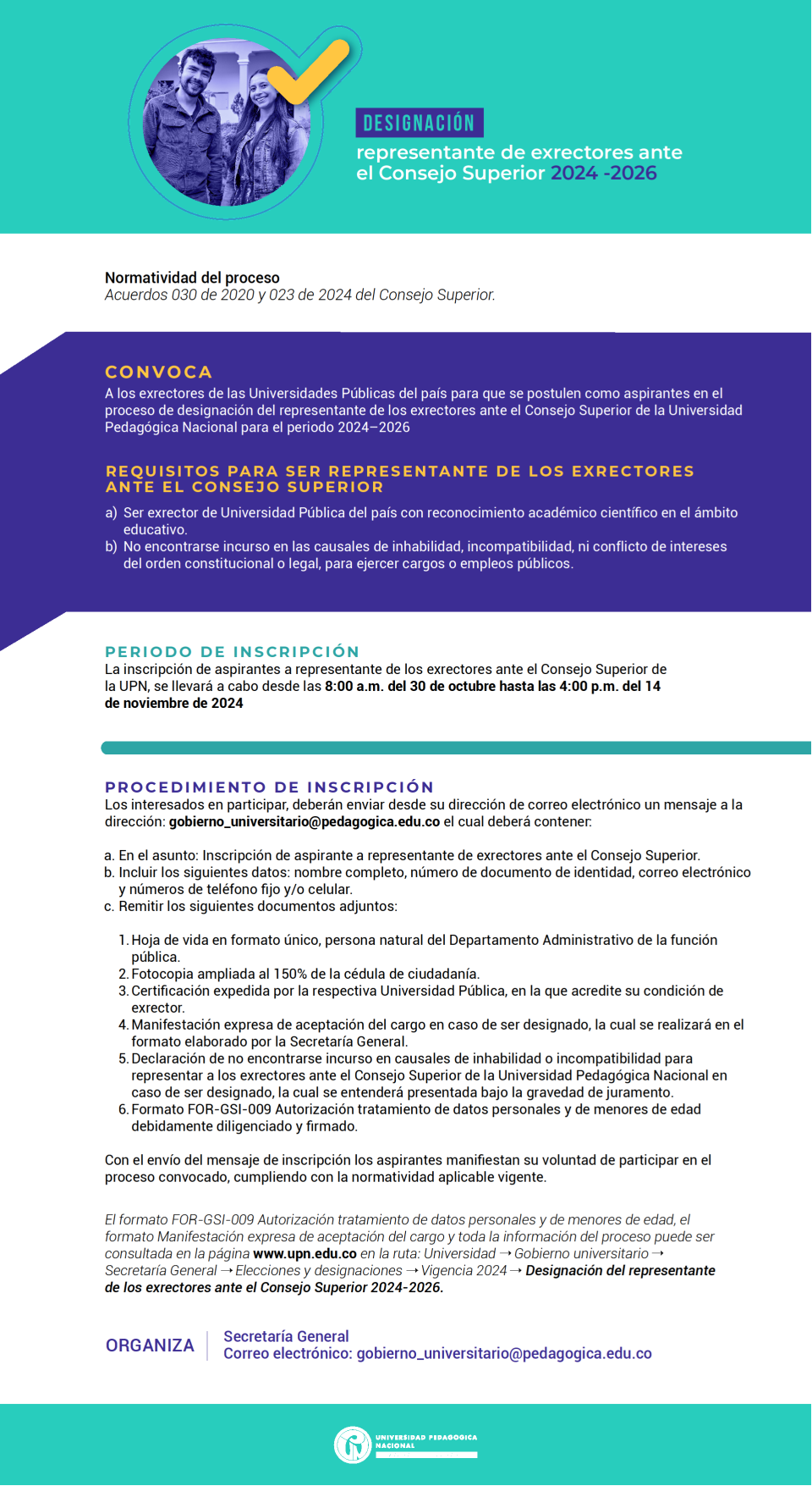 El Consejo Superior de la Universidad Pedagógica Nacional, a través de la Secretaría General, ha dado apertura a la convocatoria para la designación del representante de los exrectores ante este colegiado para el periodo 2024-2026.
