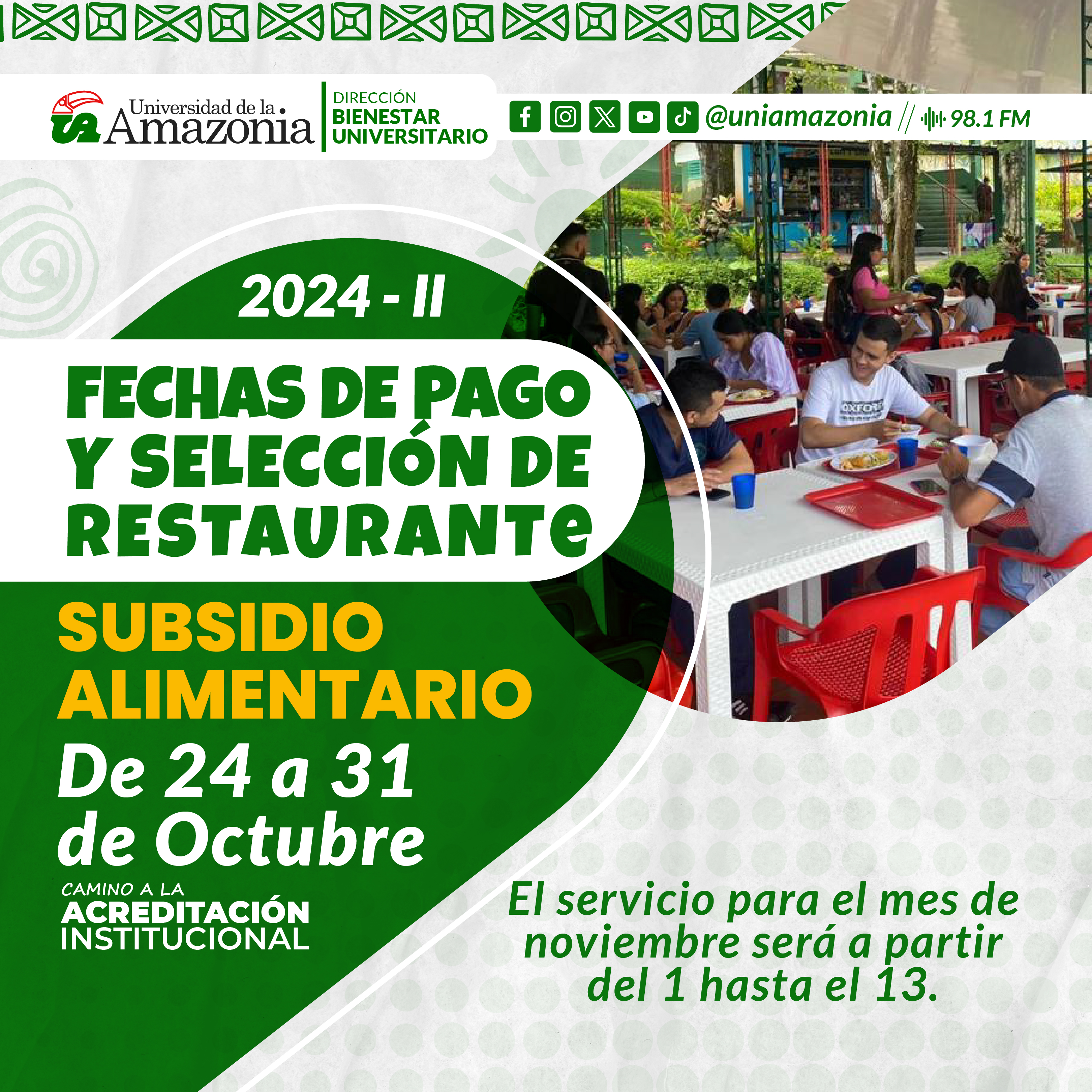 La Universidad de la Amazonia desde la Dirección de Bienestar Universitario, área de Promoción y Apoyo Socioeconómico, se permite informarles a los estudiantes beneficiarios del Programa Subsidio Alimentario: