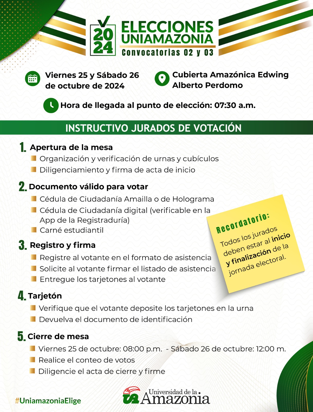 Tu participación es clave para garantizar una jornada electoral transparente y organizada. No olvides asistir puntualmente al inicio y cierre de la jornada. ¡Gracias por tu compromiso!