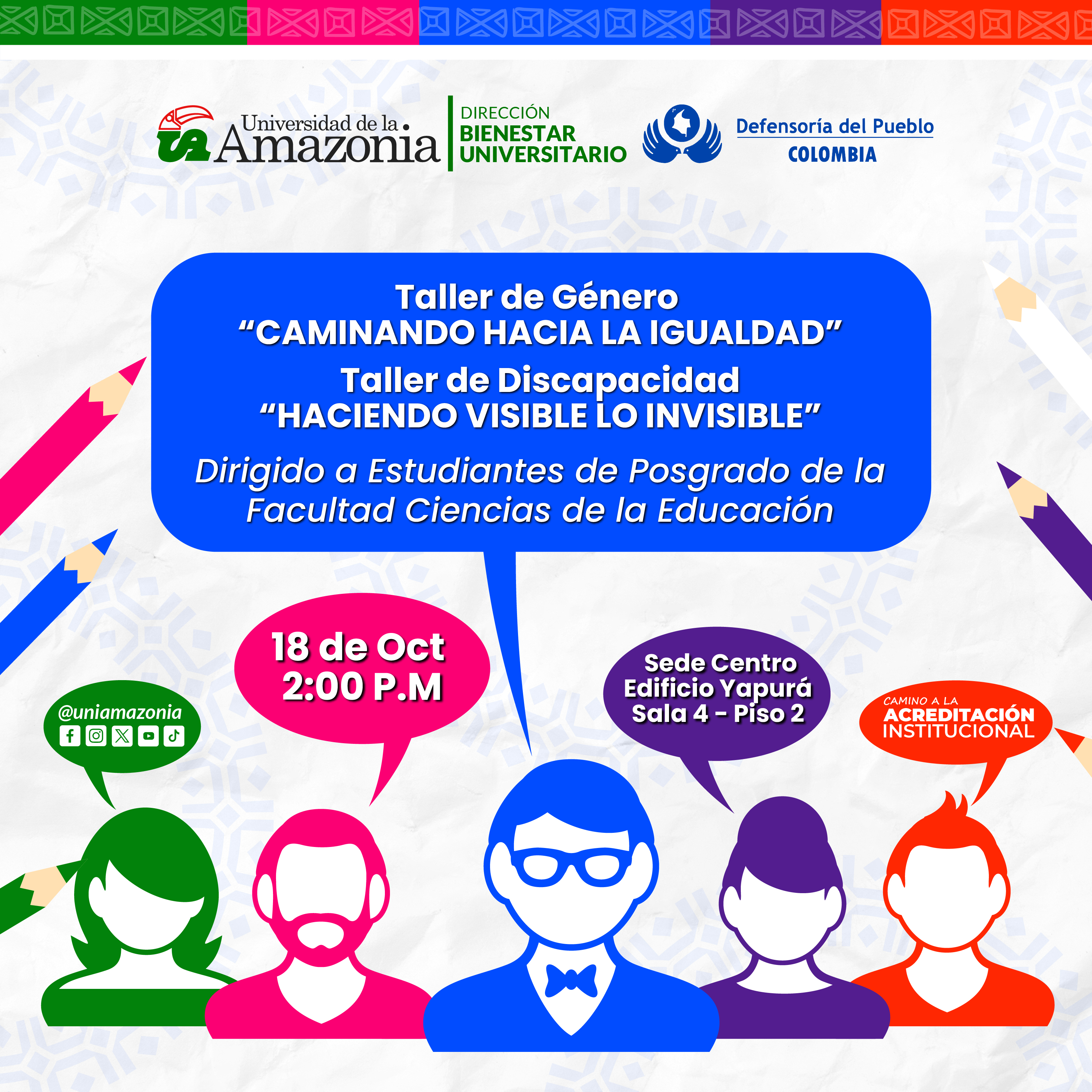 Desde la Dirección de Bienestar Universitario, el área de Inclusión Social, invita a los y las estudiantes de Posgrado de la Facultad Ciencias de la Educación a participar del taller de Género" Caminando hacia la igualdad" y Discapacidad "Haciendo visible lo invisible".