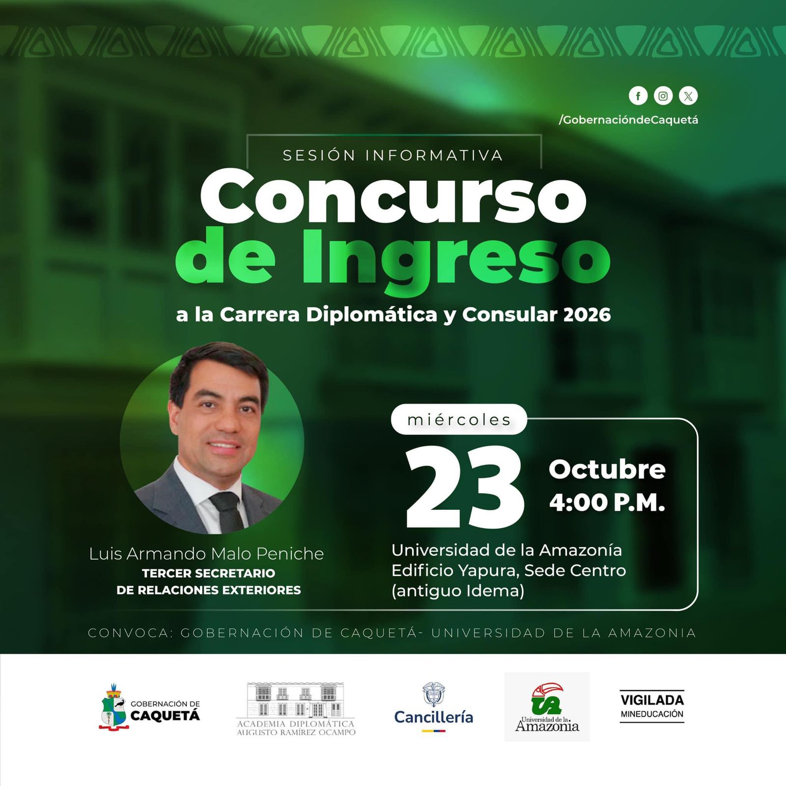 La Gobernación del Caquetá en alianza con la Universidad de la Amazonia y la Academia Diplomática Augusto Ramírez Ocampo, los invita a la Sesión Informativa sobre el Concurso de Ingreso a la Carrera Diplomática y Consular 2026.