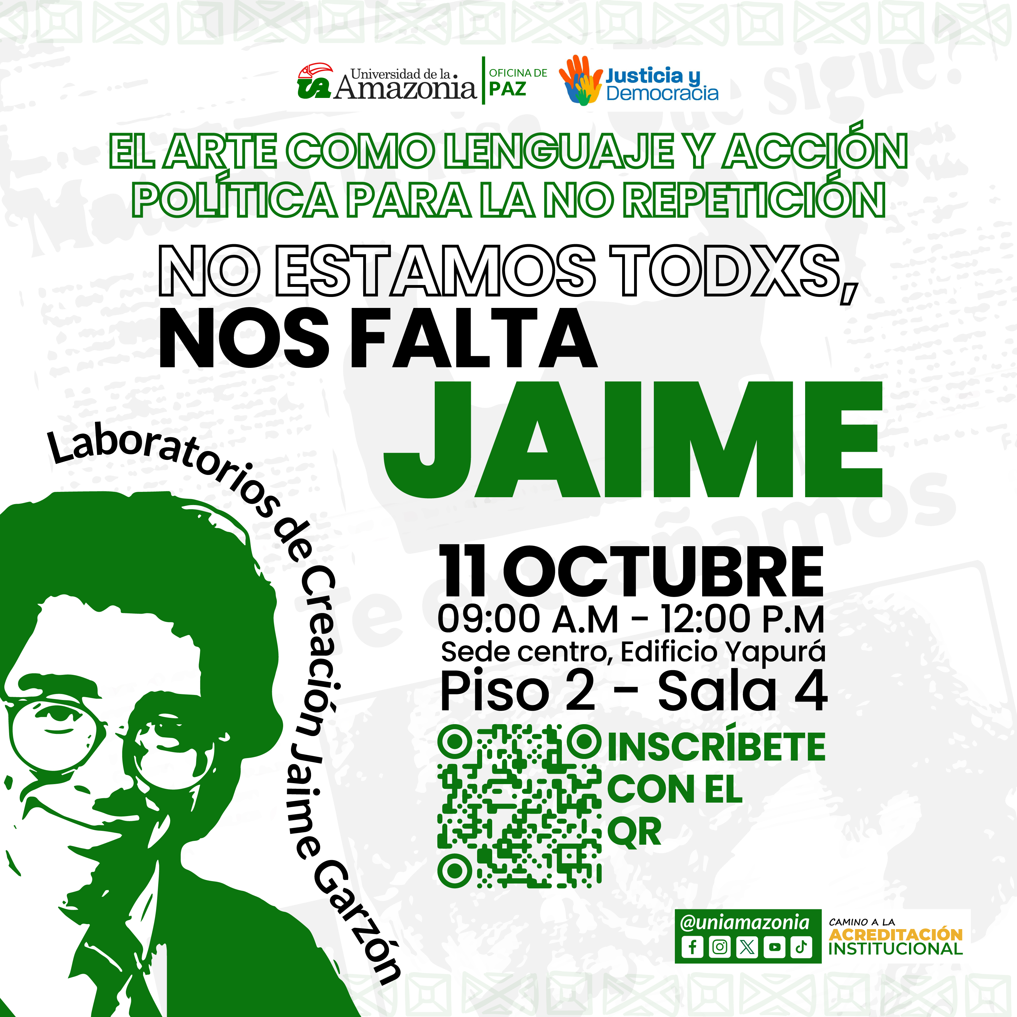 La Oficina de Paz de la Universidad de la Amazonia, en articulación con la organización Justicia y Democracia, invita a toda la comunidad universitaria a participar de la campaña "No estamos todxs, nos falta Jaime", en homenaje a Jaime Garzón. ¡Únete a los Laboratorios de Creación y acción política para la no repetición!
