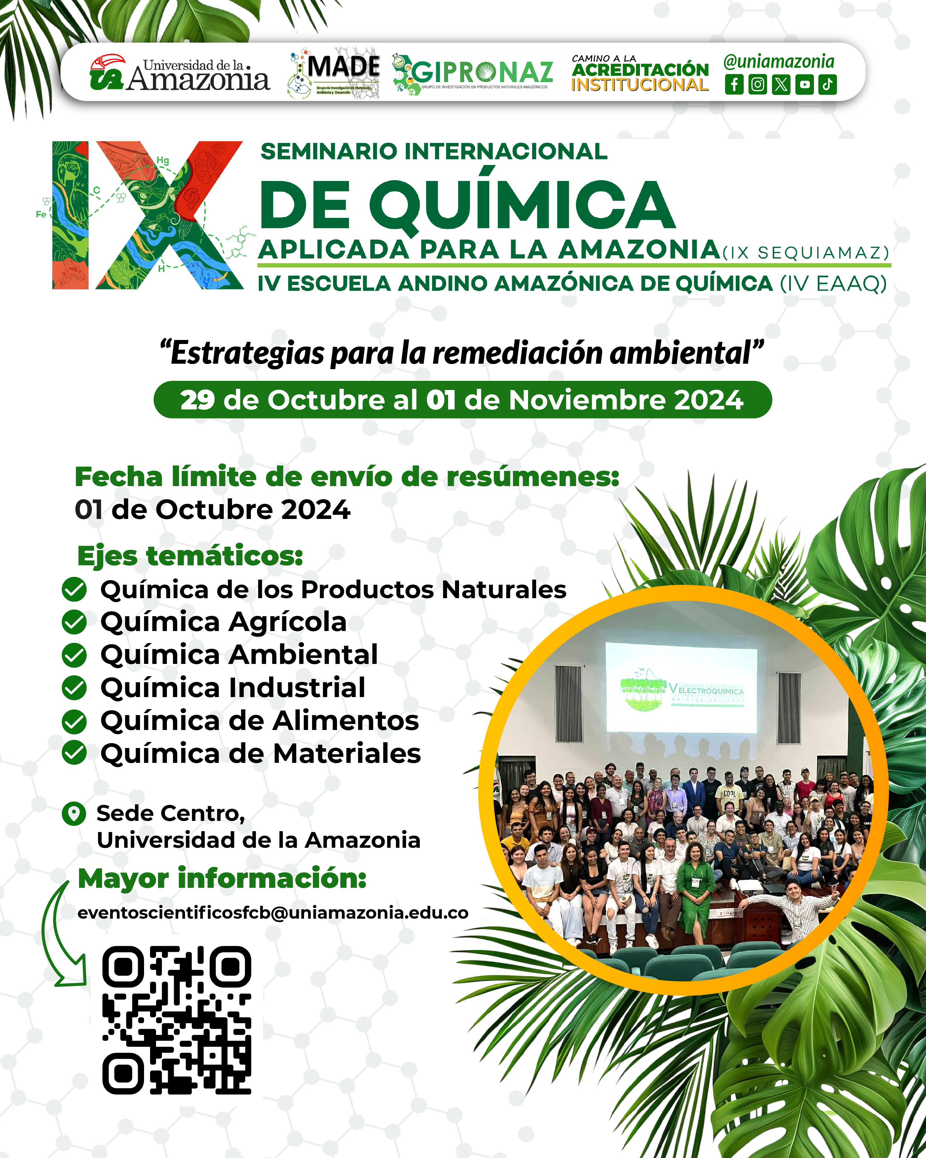 El IX SEMINARIO INTERNACIONAL DE QUÍMICA APLICADA (IX SEQUIAMAZ) y la IV Escuela Andino Amazónica de Química (IV EAAQ), contará con ponentes destacados, actividades especiales, networking y estamos encantados de ofrecer una extensión del plazo para que más personas puedan unirse a nosotros.
