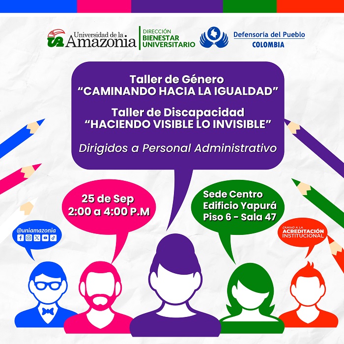 Desde la Dirección de Bienestar Universitario, el área de Inclusión Social invita al personal administrativo, a participar del taller de género "CAMINANDO HACIA LA IGUALDAD" y taller de discapacidad "HACIENDO VISIBLE LO INVISIBLE".