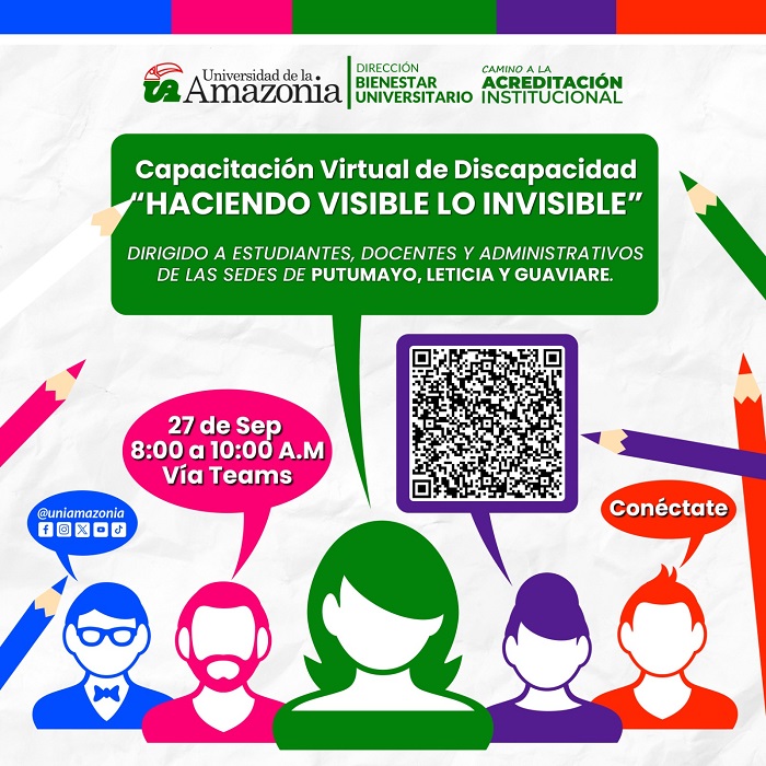 La Dirección de Bienestar Universitario, a través del área de Inclusión Social, invita a docentes, estudiantes y administrativos de las sedes de Putumayo, Leticia y Guaviare a participar en la capacitación virtual sobre discapacidad: "HACIENDO VISIBLE LO INVISIBLE".