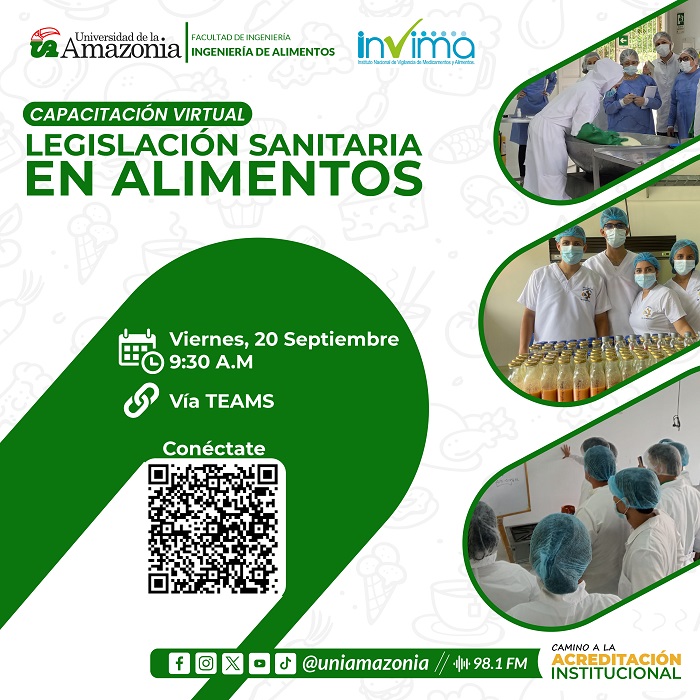 La Universidad de la Amazonía, a través del Programa de Ingeniería de Alimentos y en colaboración con el Instituto Nacional de Vigilancia de Medicamentos y Alimentos (INVIMA), extiende la invitación a la capacitación virtual "Legislación Sanitaria en Alimentos". Este evento se llevará a cabo el próximo viernes 20 de septiembre y está dirigido a profesionales y al sector productivo.