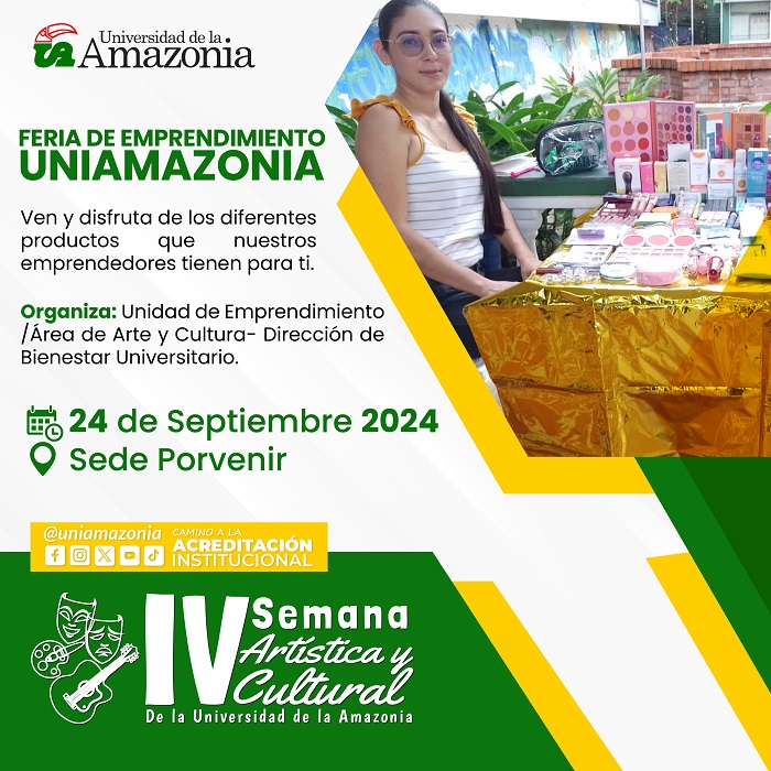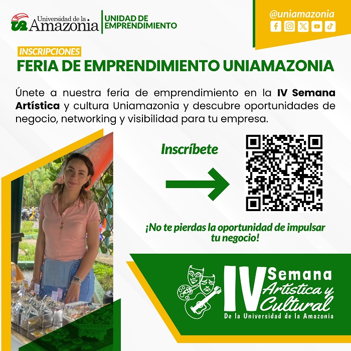 La Unidad de Emprendimiento de la Universidad de la Amazonia invita a todos los emprendedores a participar en la Feria de Emprendimiento que se realizará durante la IV Semana Artística y Cultural.