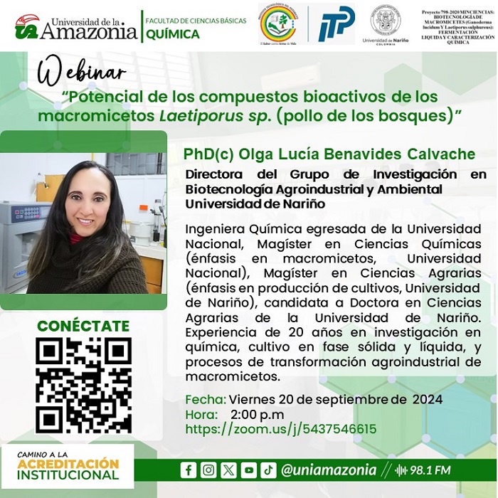 La Dra. (c) Olga Lucía Benavides Calvache nos presentará una interesante charla sobre "El potencial de los compuestos bioactivos de los macromicetos Laetiporus sp. (Pollo de los bosques)".