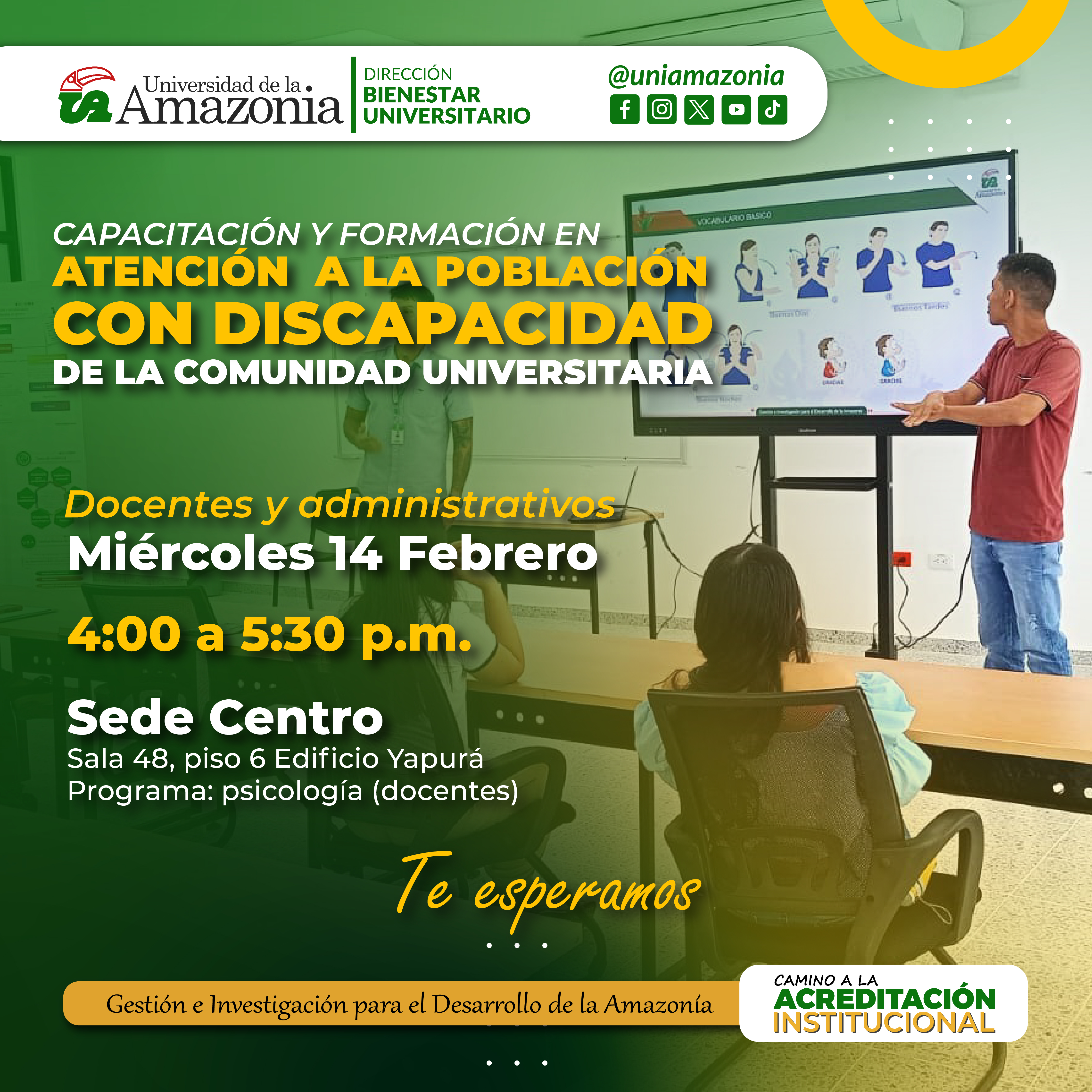 Desde la Dirección de Bienestar Universitario el área de inclusión social , invita a la Comunidad Administrativa y docentes a participar en la capacitación y formación en atención a la población con discapacidad, dando cumplimiento a la " Política institucional en la atención de las personas con discapacidad en el marco de la educación inclusiva de la Universidad de la Amazonia, acuerdo 081 de 2022