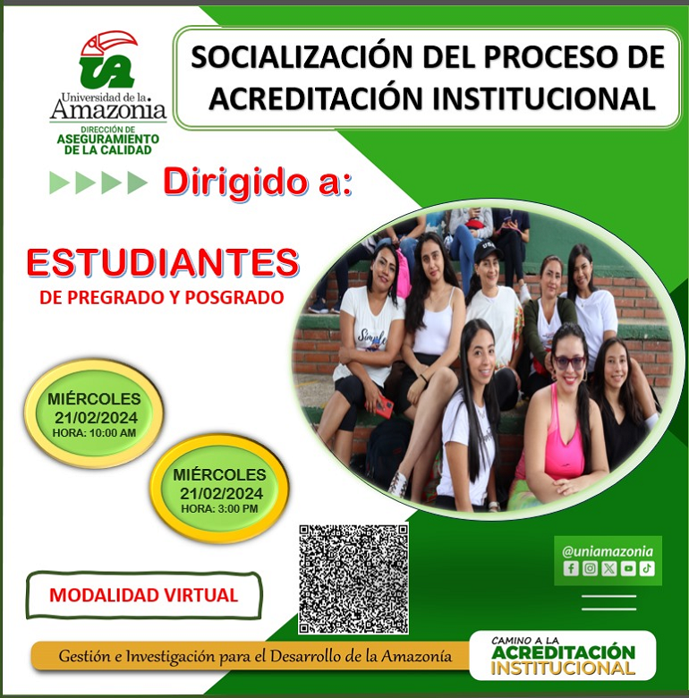 El Rector y la Directora de Aseguramiento de la Calidad de la Universidad de la Amazonia. invitan a la socialización del proceso de acreditación institucional, dirijo a estudiantes de Pregrado y Posgrado.