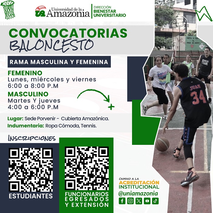 Desde la Dirección de Bienestar Universitario queremos invitar a la comunidad de la universidad de la amazonia para que haga parte del deporte Baloncesto
