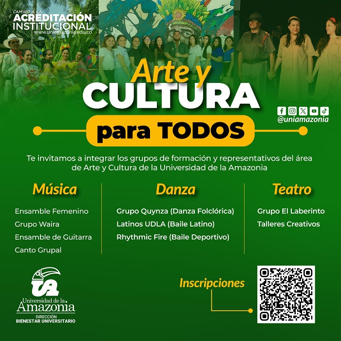 La Universidad de la Amazonia, invita a la comunidad académica a participar de procesos de formación o grupos representativos en teatro, música y danzas. De igual forma, se extiende la invitación a participar del programa de habitos de vida saludable a través de Aero-Rumba todos los Lunes y Jueves 6:00 pm en la plazoleta pardo Leal.