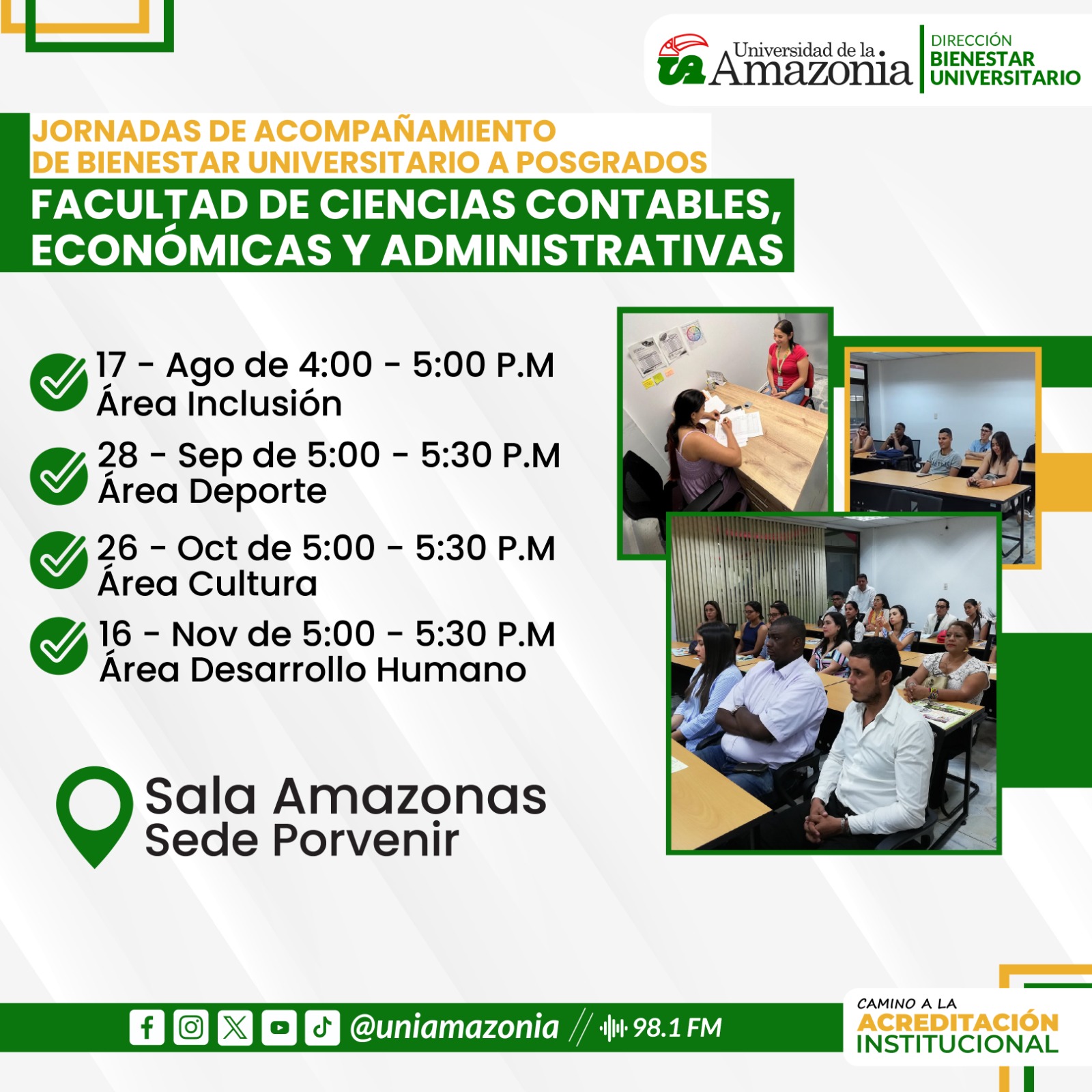 Desde la dirección de bienestar universitario hacemos extensiva la invitación a los estudiantes de posgrados de la facultad de ciencias contables, económicas y administrativas a que participen en las jornadas de acompañamiento para este semestre académico 2024-2