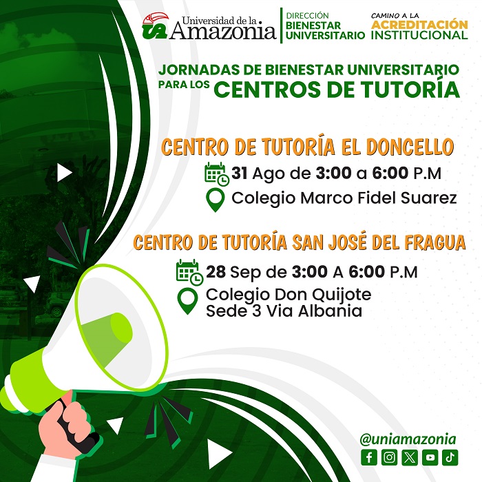 La Dirección de Bienestar Universitario invita a los estudiantes de distancia de los centros de tutoría de San José del Fragua y El Doncello a participar en la jornada de bienestar universitario.
