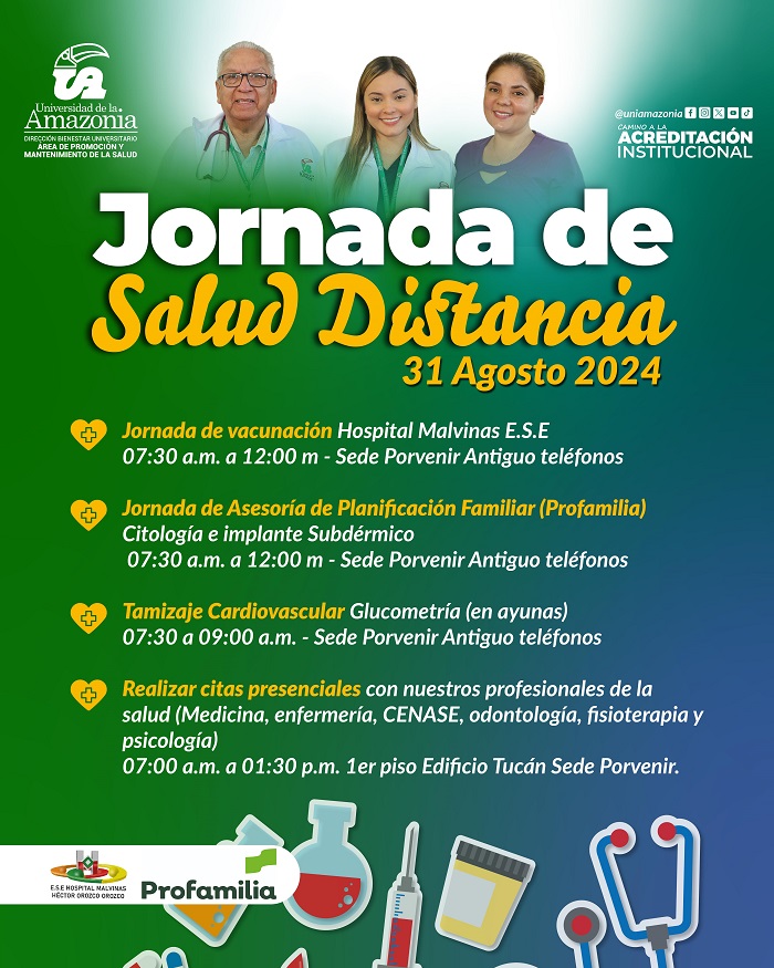 Desde la Dirección de Bienestar Universitario, en el Área de Promoción y Mantenimiento de la Salud de la Universidad de la Amazonia, queremos brindar apoyo y recursos para mantener el bienestar integral de toda la comunidad universitaria a distancia.