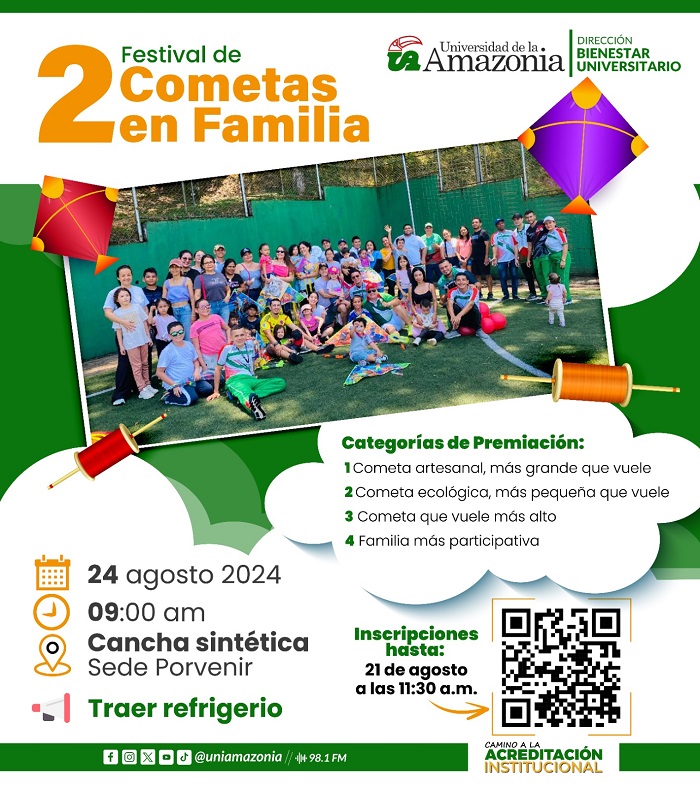 La Universidad de la Amazonia, a través del Área de Deporte y Recreación de la Dirección de Bienestar Universitario, se complace en invitar a toda la comunidad universitaria a participar en el 2DO FESTIVAL DE COMETAS EN FAMILIA.