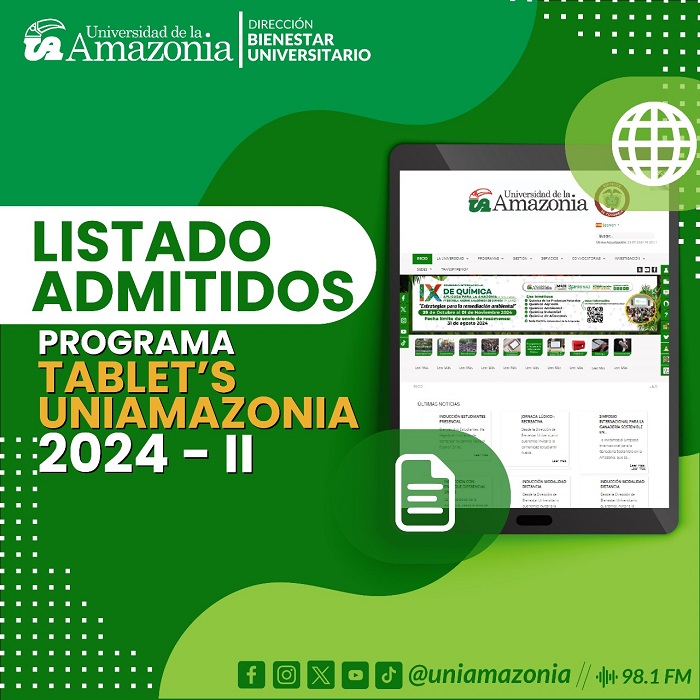 Desde la Dirección de Bienestar Universitario, el área de Promoción y Apoyo Socioeconómico de la Universidad de la Amazonia da a conocer a la comunidad académica el listado de los estudiantes de pregrado presencial y a distancia que resultaron beneficiarios de la convocatoria del Programa Tablet´s Uniamazonia 2024-II. Nota: estar pendientes de la fecha y lugar para la entrega del equipo. Mayor información: oficina de Promoción y Apoyo Socioeconómico parte baja del auditorio.