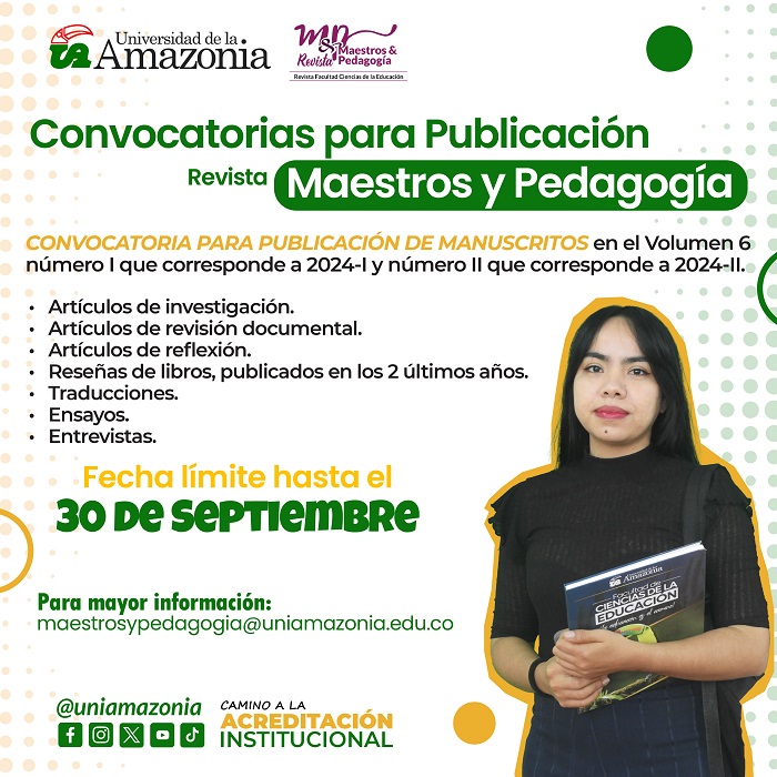 La Maestría en Educación - MAE de la Universidad de la Amazonia invita a participar en la convocatoria para el Volumen 6, números I y II de 2024. Envíen sus manuscritos y sean parte de esta iniciativa académica.