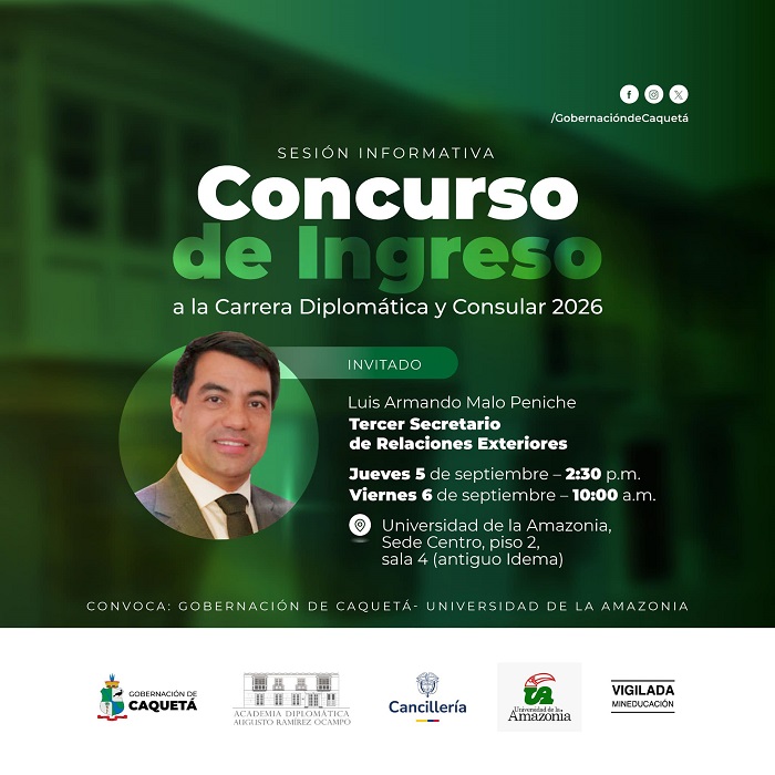 Por primera vez en el departamento, tendrás la oportunidad de conocer cómo participar en el Concurso de Ingreso a la Carrera Diplomática y Consular 2026. Si eres mayor de edad, tienes un título certificado por el Ministerio de Educación, dominas un segundo idioma de uso diplomático de las Naciones Unidas (Inglés, Francés, Árabe, Chino o Ruso), o formas parte de la comunidad académica, te invitamos a asistir a una de las siguientes sesiones informativas: