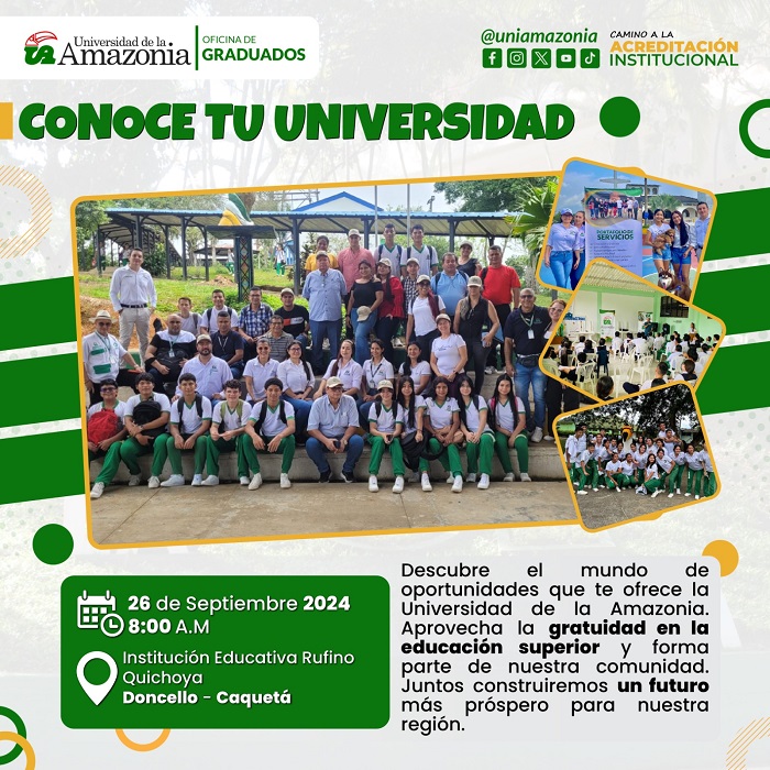 La Universidad de la Amazonia invita de manera muy especial a los estudiantes de décimo y undécimo de la Institución Educativa Rufino Quichoya, junto con sus familias, a un espacio informativo sobre la política de gratuidad en la educación superior. ¡Únete y sé parte de la familia Uniamazonia!