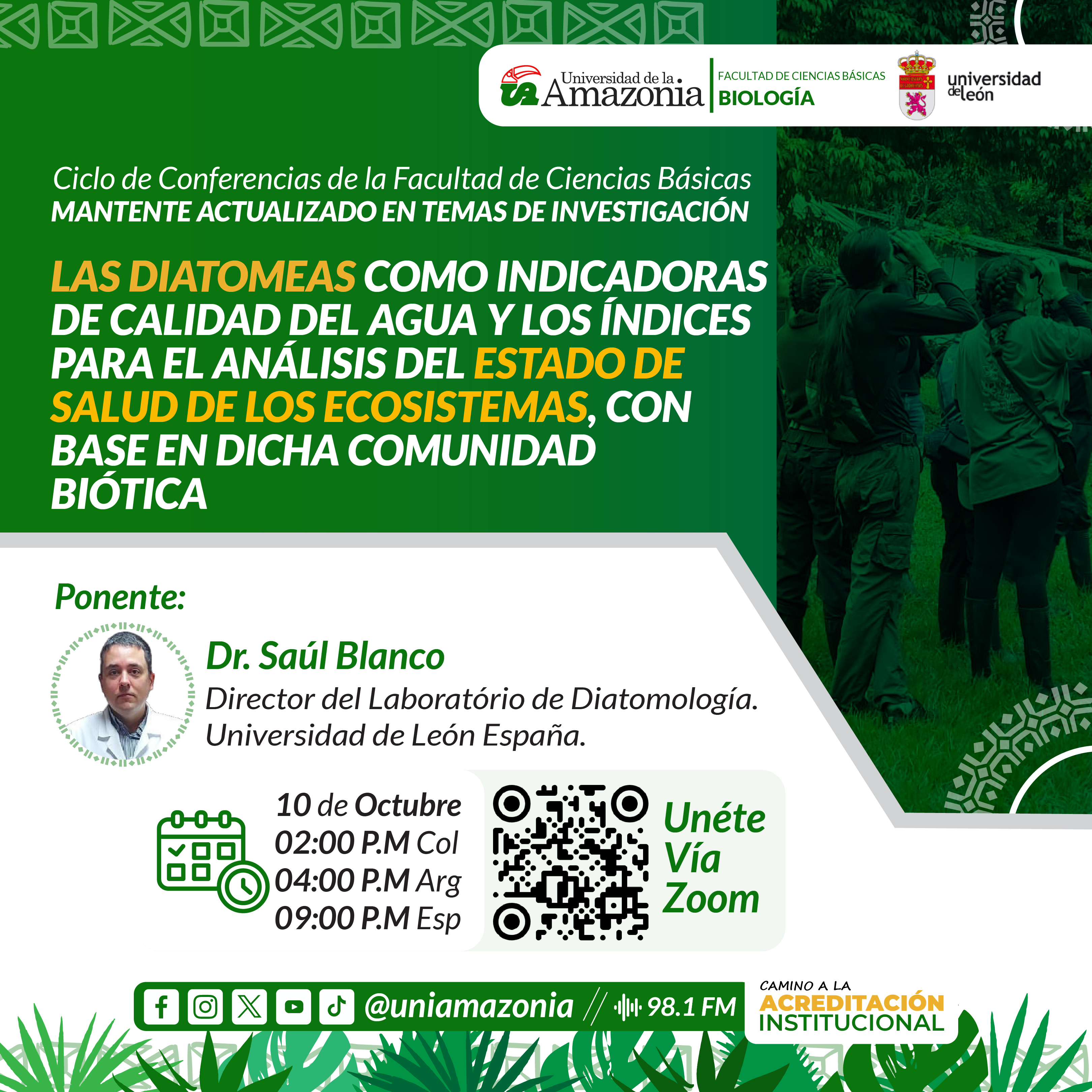 La Facultad de Ciencias Básicas de la Universidad de la Amazonia te invita al ciclo de conferencias, donde el Dr. Saúl Blanco, director del Laboratorio de Diatomología de la Universidad de León, España, nos hablará sobre "Las diatomeas como indicadoras de calidad del agua y los índices para el análisis del estado de salud de los ecosistemas".