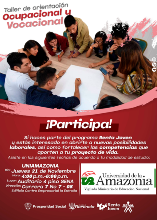 Prosperidad Social, en articulación con La Universidad de La Amazonia, La Alcaldía de Florencia y La Agencia Pública de Empleo SENA, te invitan a participar en el taller de orientación ocupacional, en donde hablaremos de: