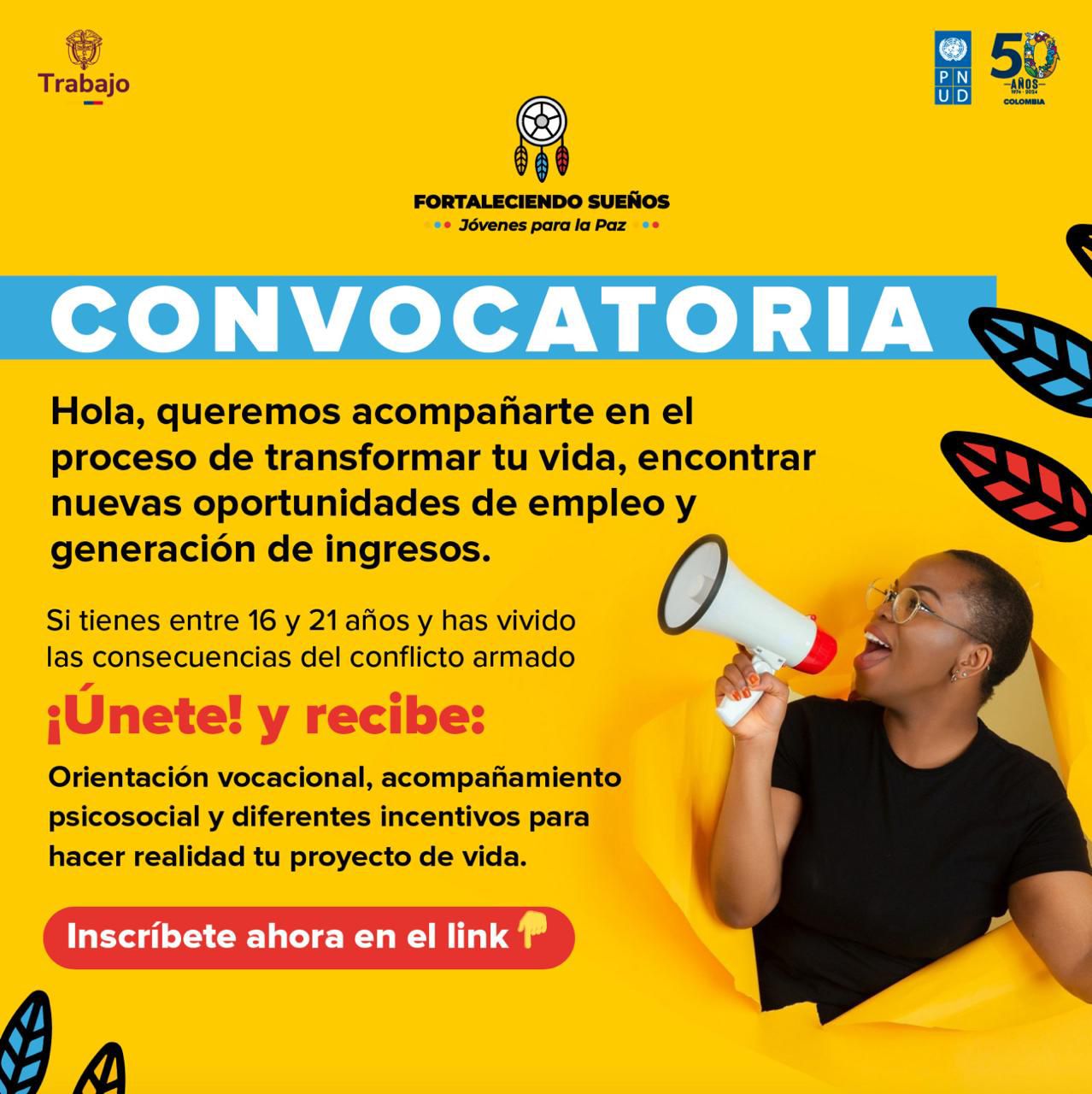 El programa Fortaleciendo sueños: Jóvenes para la Paz está diseñado para brindar a las y los jóvenes, herramientas que les permitan tomar decisiones informadas sobre su proyecto de vida. Buscamos incentivar la educación, la formación y la generación de ingresos, contribuyendo a su reparación integral y estabilización socioeconómica.