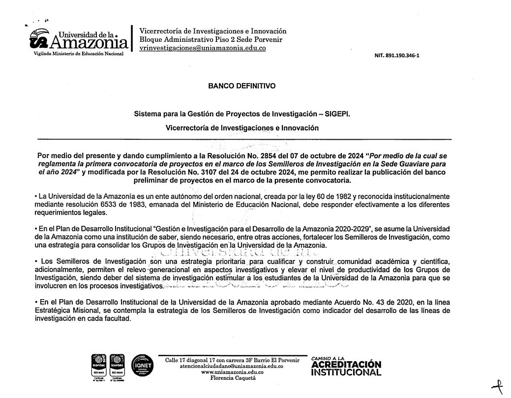 La Universidad de la Amazonia, a través de la Vicerrectoría de Investigaciones e Innovación da a conocer los resultados definitivos de la convocatoria reglamentada mediante la Resolución No. 2854 del 07 de octubre de 2024 "Por medio de la cual se reglamenta la primera convocatoria de proyectos en el marco de los semilleros de investigación de la sede Guaviare para el año 2024"