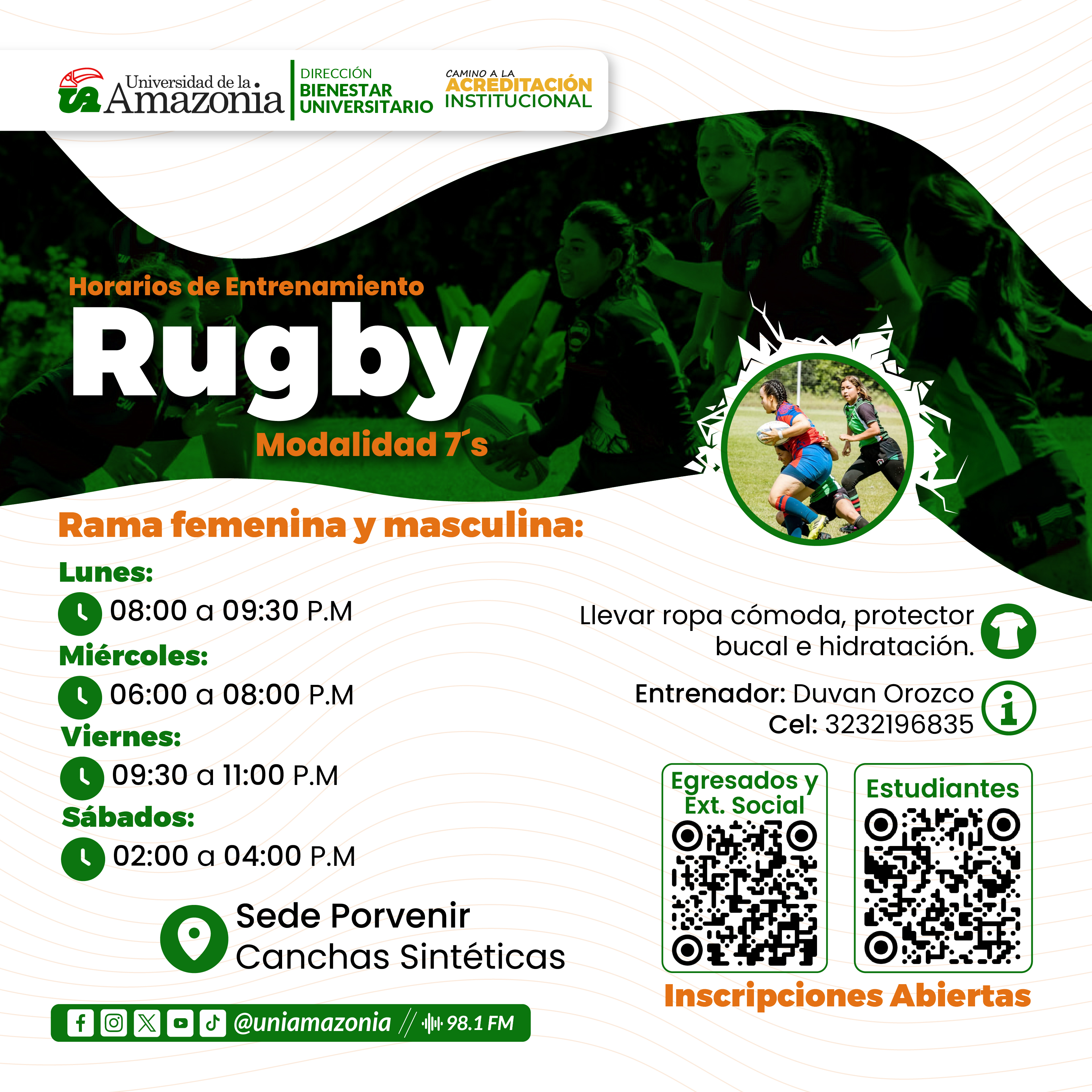 Consulta los horarios de entrenamiento de Rugby y juega con determinación garra en Universidad de la Amazonia.