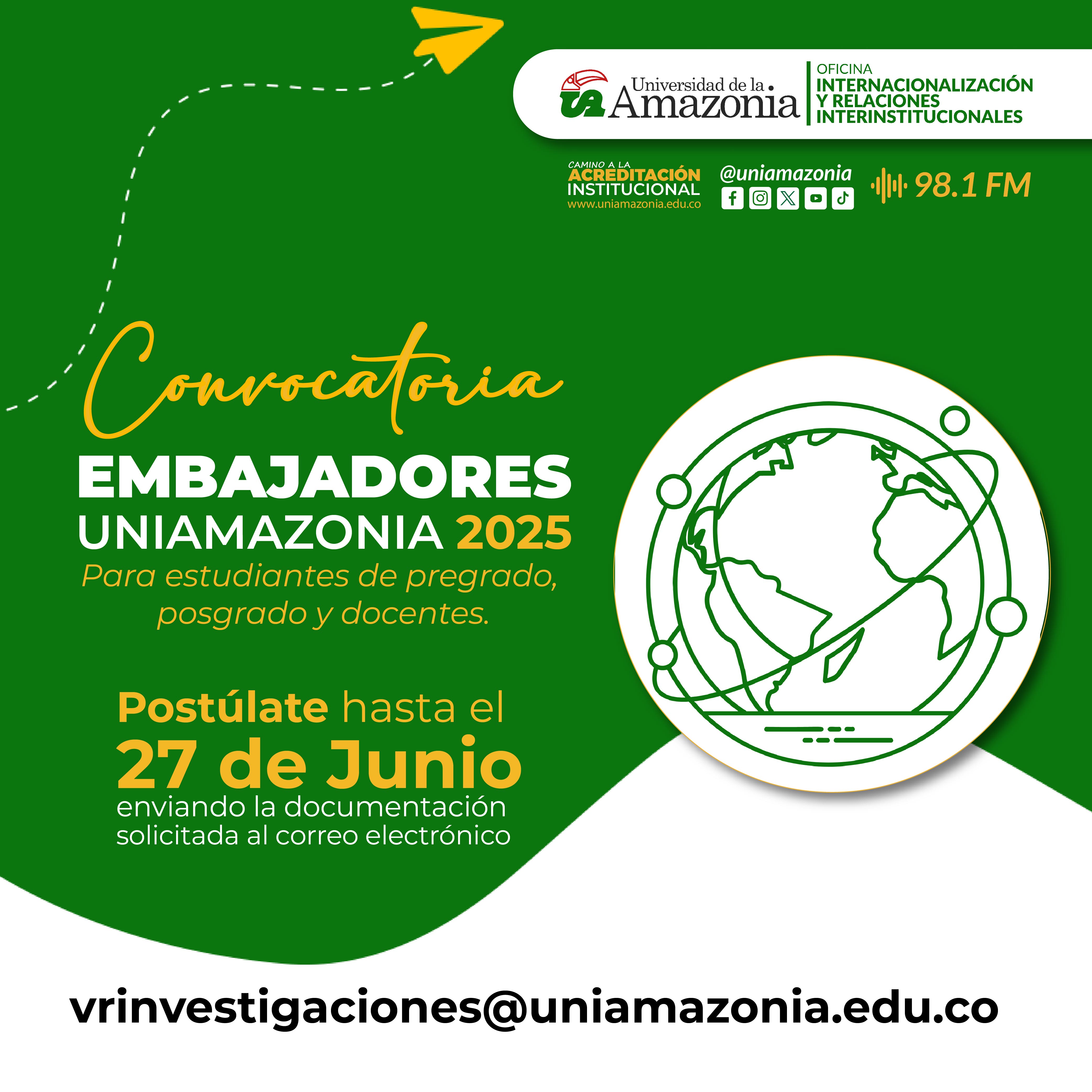 Para requisitos y condiciones, consulta la resolución No. 1939 del 11 de Junio de 2025 de la Universidad de la Amazonia, o escríbenos a Esta dirección de correo electrónico está protegida contra spambots. Usted necesita tener Javascript activado para poder verla.