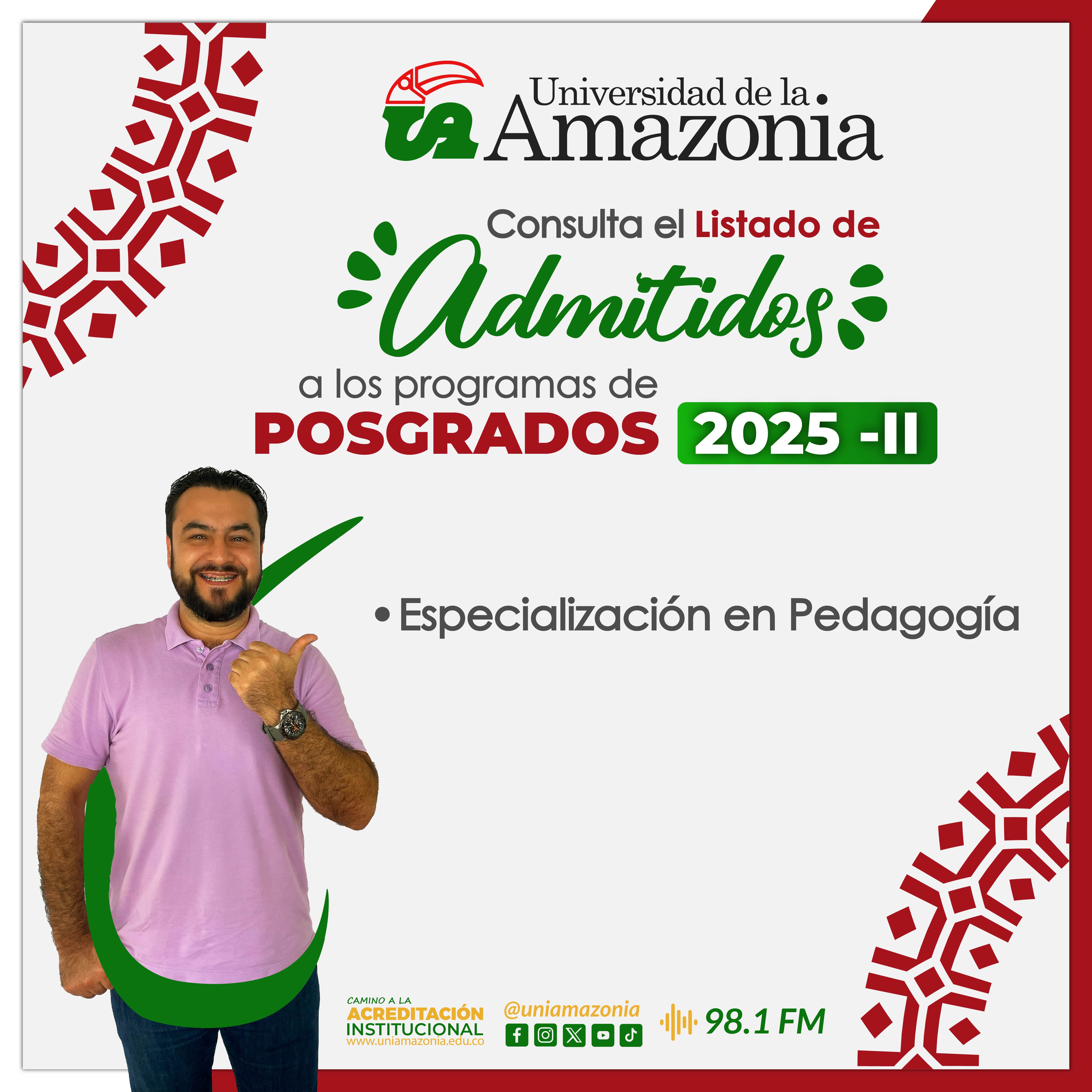 De conformidad con el Calendario Académico para el desarrollo de las actividades correspondientes al segundo periodo académico 2025 - ll en los Programas de Posgrado, se publica el listado de admitidos a la Universidad de la Amazonia para el programa: