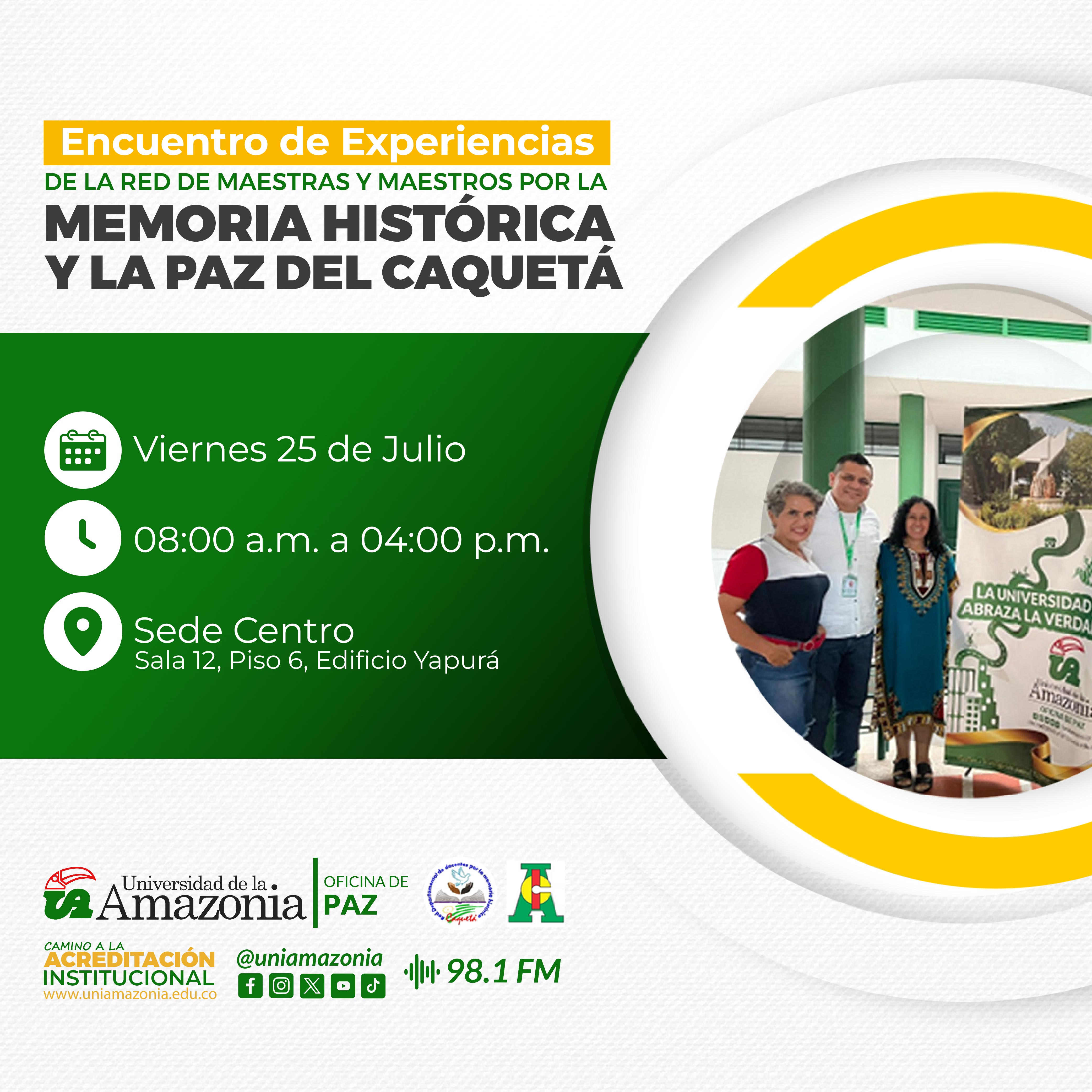 Este 25 de julio, la Oficina de Paz, adscrita a la Facultad de Ciencias de la Educación, lidera el Encuentro de Experiencias de la Red de Maestras y Maestros por la Memoria Histórica y la Paz del Caquetá junto con la asociación de trabajadores de la Educación AICA, un espacio para fortalecer el trabajo colaborativo entre docentes comprometidos con la verdad, la memoria y la reconciliación.