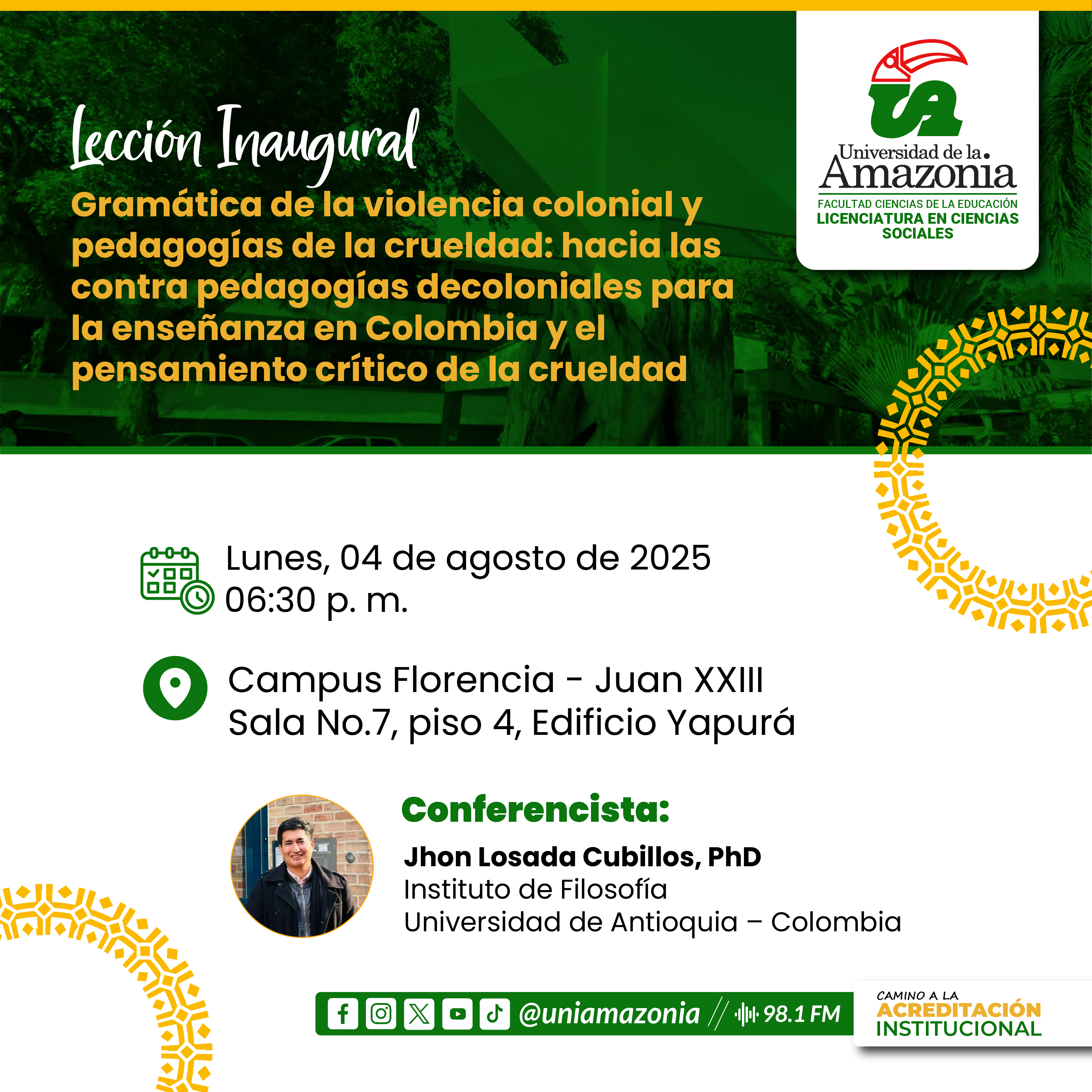 En esta ocasión, contaremos con la conferencia titulada “Gramática de la violencia colonial y pedagogías de la crueldad: hacia las contra pedagogías decoloniales para la enseñanza en Colombia y el pensamiento crítico de la crueldad”, a cargo del Dr. Jhon Losada Cubillos, investigador del Instituto de Filosofía de la Universidad de Antioquia.