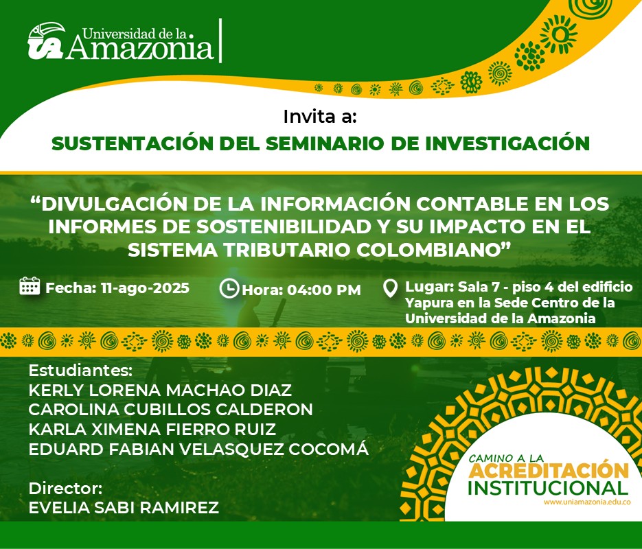 La Universidad de la Amazonia, a través del programa académico de Contaduría Pública, tiene el agrado de invitar a la comunidad universitaria y al público en general a la Socialización de Trabajos de Grado a realizarse en el marco del Seminario de Investigación.