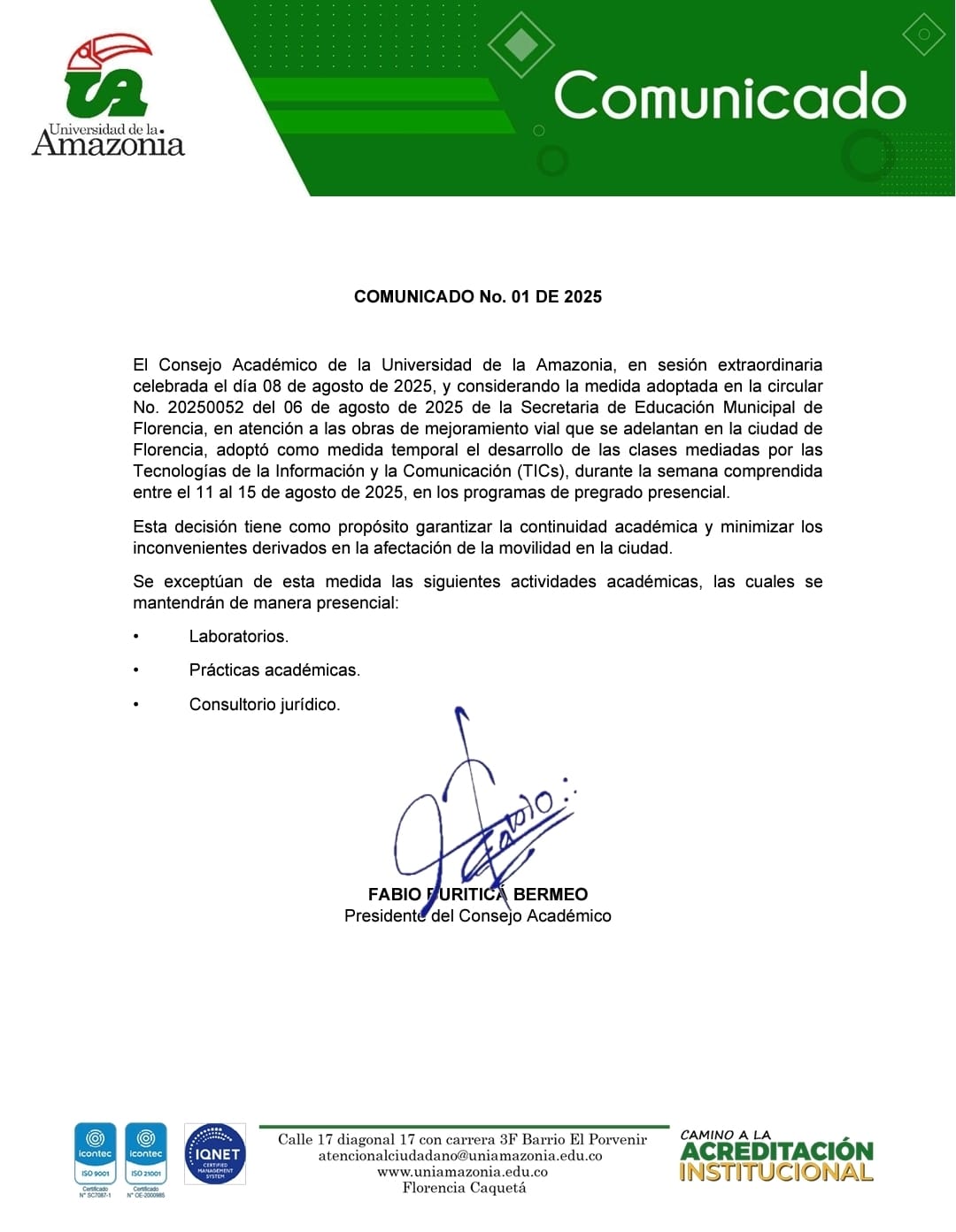 El consejo Académico de la Universidad de la Amazonia da a conocer el Comunicado No. 01 del 08 de agosto de 2025, en el que se presentan las medidas adoptadas para el desarrollo de actividades académicas, teniendo en cuenta las obras de mejoramiento vial que se adelantan en la ciudad de Florencia, Caquetá.