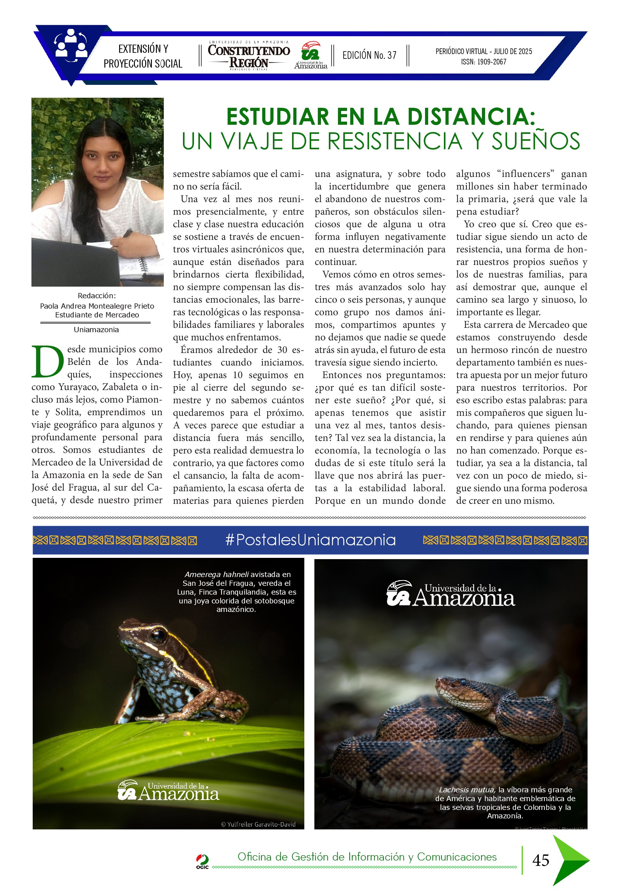 Artículo No 14. En esta edición, Paola Andrea Montealegre, estudiante del programa de Mercadeo del Centro de Tutoría de San José del Fragua, cuenta su perspectiva al estudiar desde zonas apartadas del departamento, enfrentando diariamente el reto de estudiar a la distancia con sus compañeros.