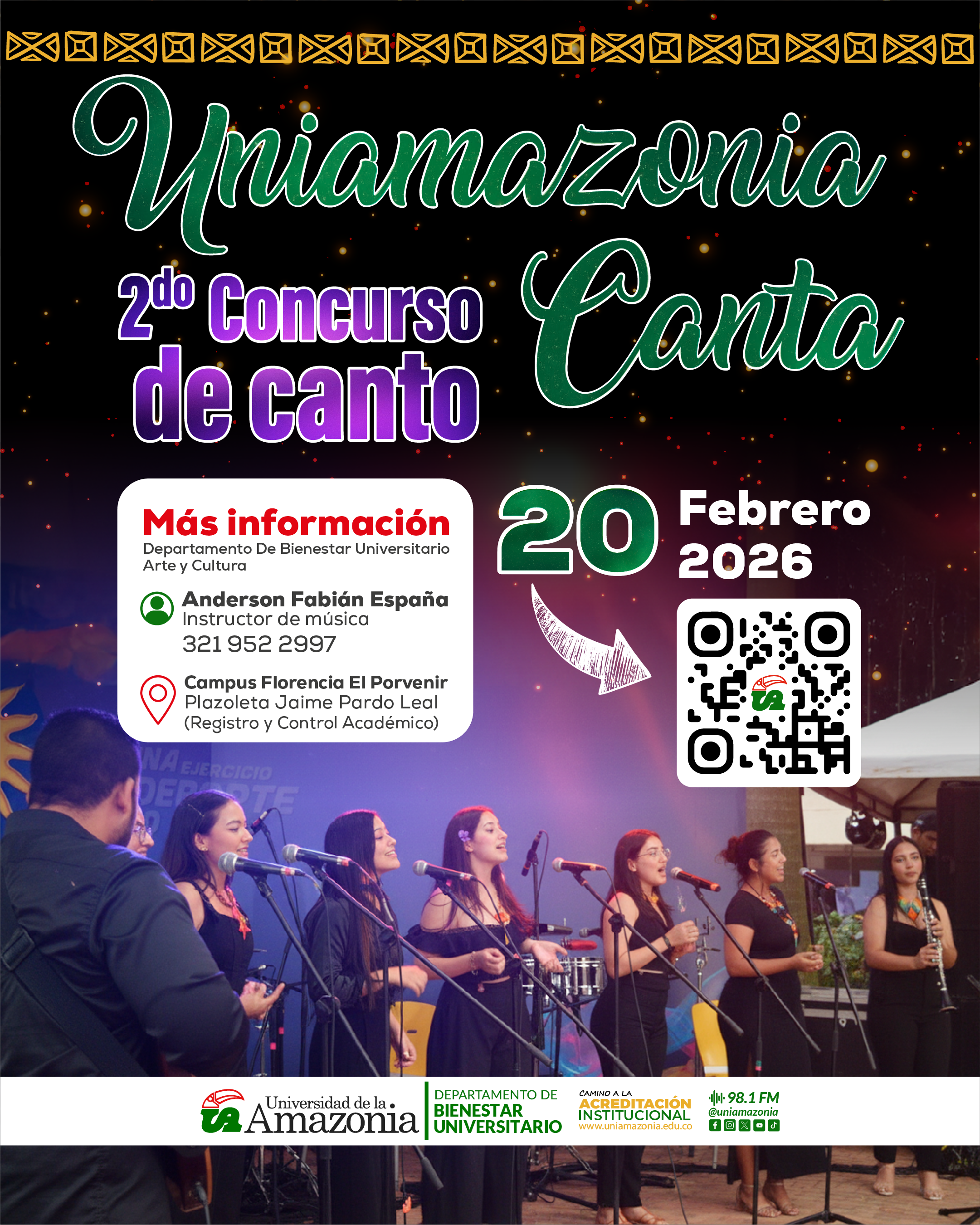 La Universidad de la Amazonia, desde el Área de Arte y Cultura, invita a todos los estudiantes, docentes y administrativos de nuestra alma mater, así como a la querida comunidad florenciana, a participar en el 2.º Concurso de Canto “Uniamazonia Canta”