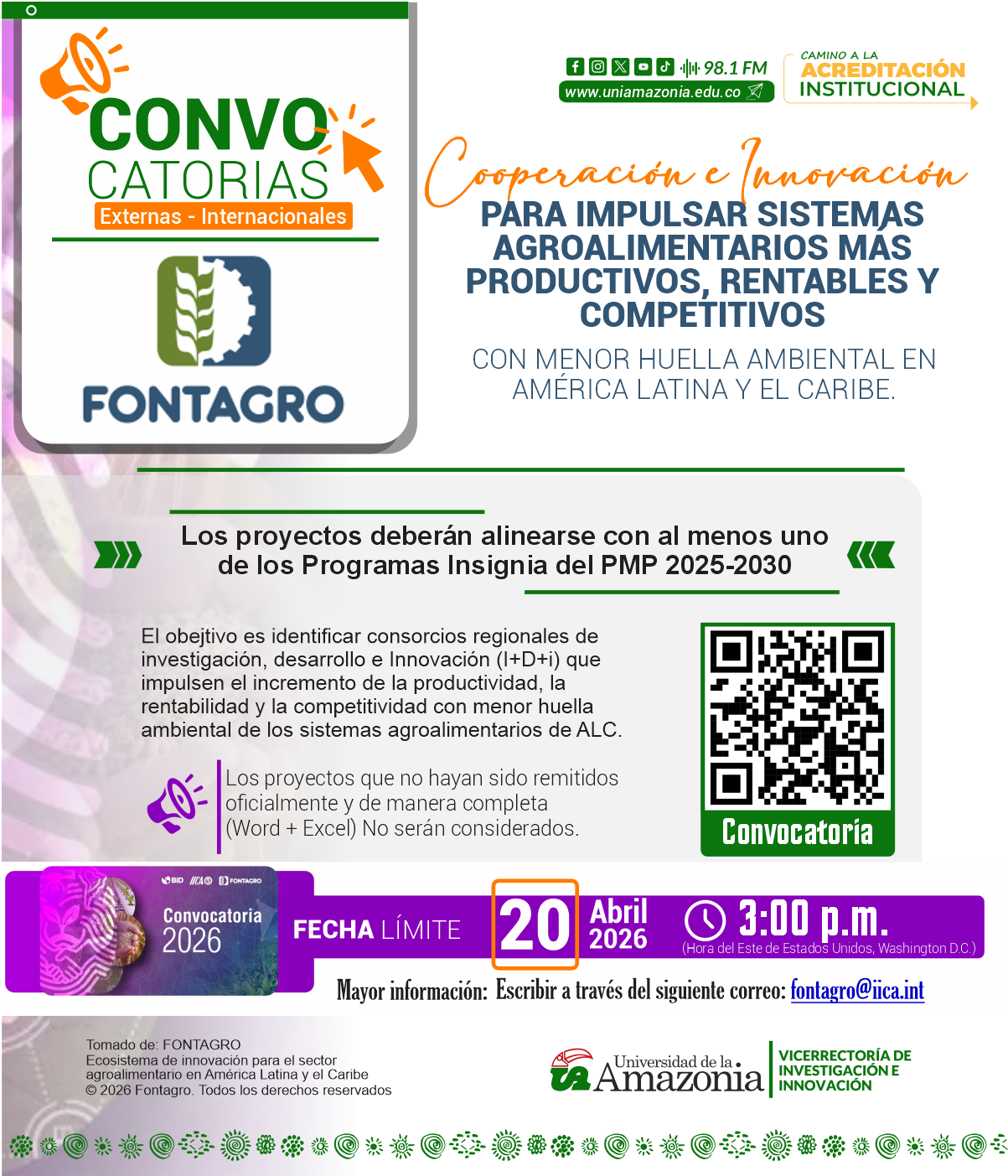 La Vicerrectoría de Investigación e innovación comparte e invita a investigadores, docentes y grupos de investigación a presentar sus iniciativas en la CONVOCATORIA EXTERNA Cooperación e innovación para impulsar sistemas agroalimentarios más productivos, rentables y competitivos con menor huella ambiental en América Latina y el Caribe.