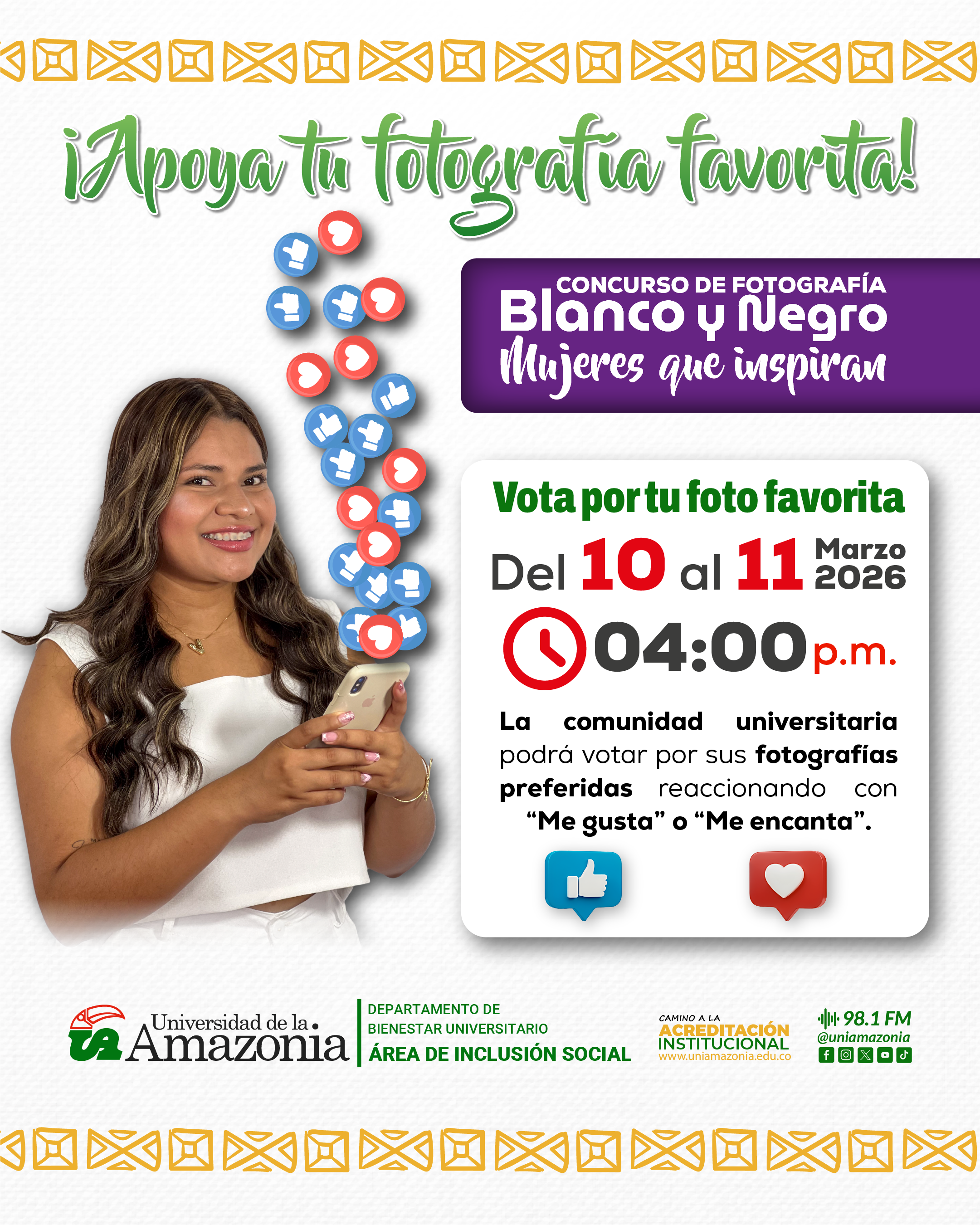En el marco de la Conmemoración del Día Internacional de la Mujer 2026: “Derechos, justicia y acción para todas las mujeres en la educación superior”, el Departamento de Bienestar Universitario de la Universidad de la Amazonia invita a la comunidad universitaria y al público en general a participar votando por su fotografía favorita.