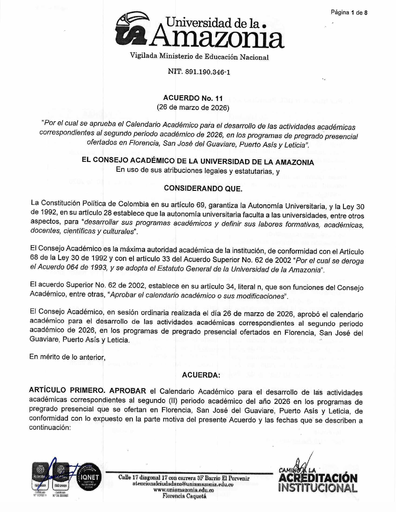 El Consejo Académico de la Universidad de la Amazonia en uso de sus atribuciones legales y estatutarias da a conocer los Acuerdo N.º 11 “Por el cual se aprueba el Calendario Académico para el desarrollo de las actividades académicas correspondientes al segundo periodo académico de 2026, en los programas de pregrado presencial ofertados en Florencia, San José del Guaviare, Puerto Asís y Leticia” y N.º 12  de 2026 “Por el cual se aprueba el Calendario Académico para el desarrollo de las actividades académicas correspondientes al segundo periodo académico de 2026, en los programas de pregrado distancia ofertados en Campus Florencia, Centros Tutoriales de San José del Fragua y El Doncello”.