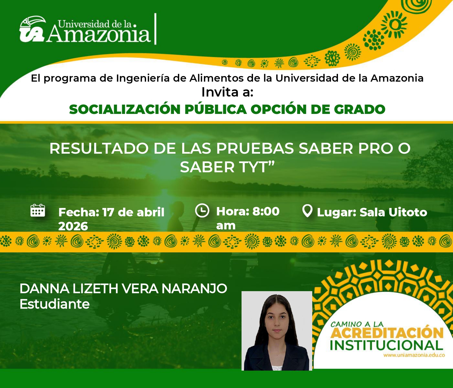 La Universidad de la Amazonia, a través del Programa de Ingeniería de Alimentos, tiene el gusto de invitar a la comunidad universitaria y al público en general a la socialización pública de la opción de grado: